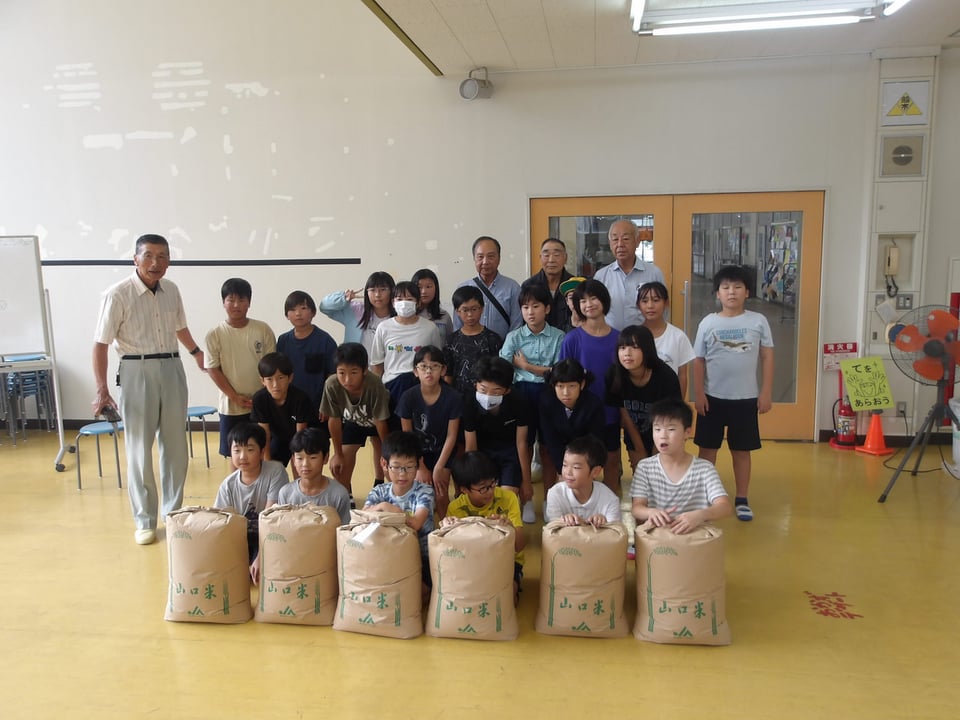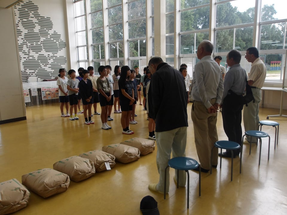 本日、地域の方々が、一緒に田植えをして10月に稲刈りをしたお米を学校へ届けてくださいました。1袋30キログラムあるので、あまりの重たさに5年生はびっくりしていました。田植えをしてから稲刈りまで、地域の方々がお世話をしてくださったことに感謝してありがたくいただきました。このお米は、給食や家庭科の調理実習の時に使わせていただきます。「虹のきらめき」という品種だそうで、食べるのがとても楽しみです。地域の皆様、本当にありがとうございました。