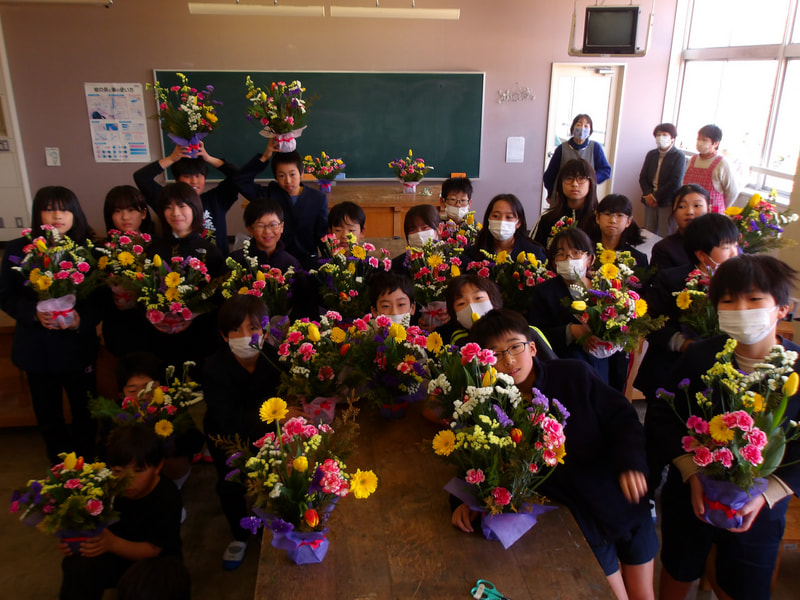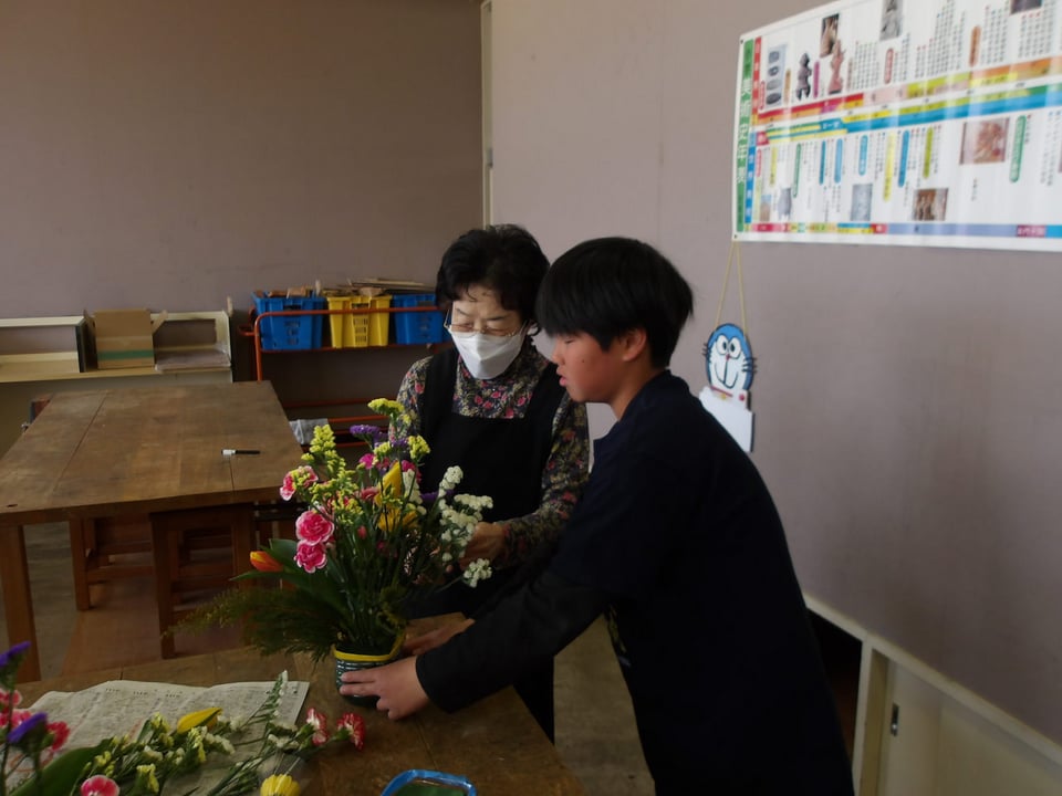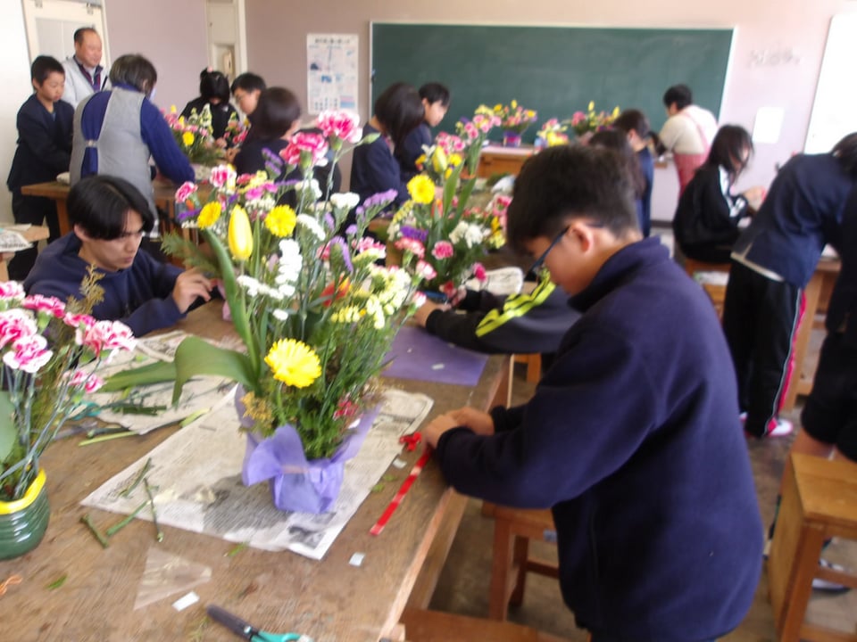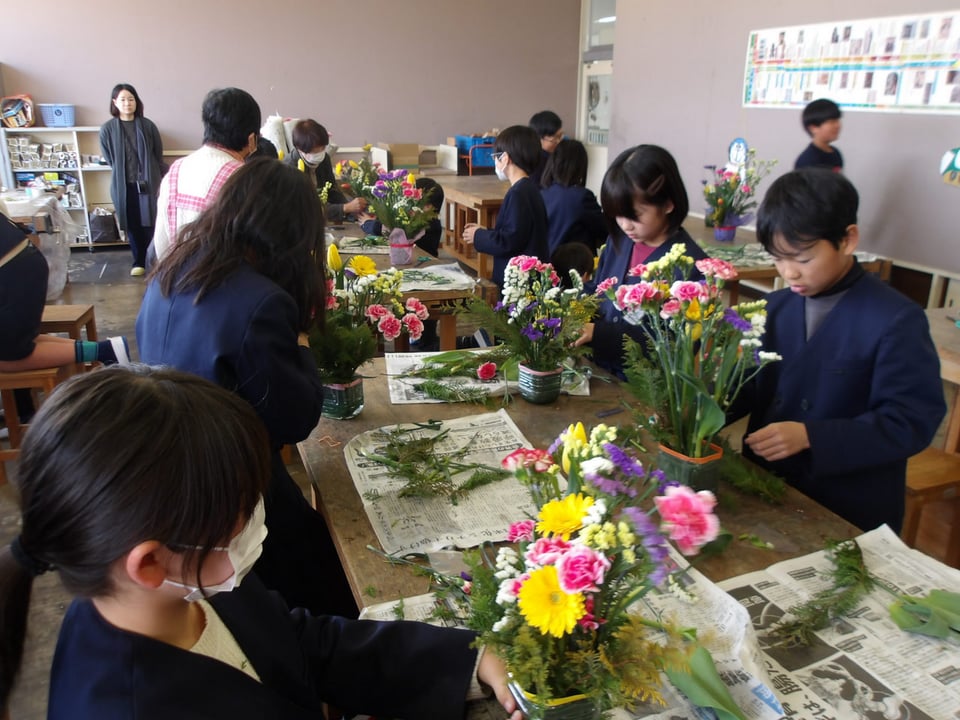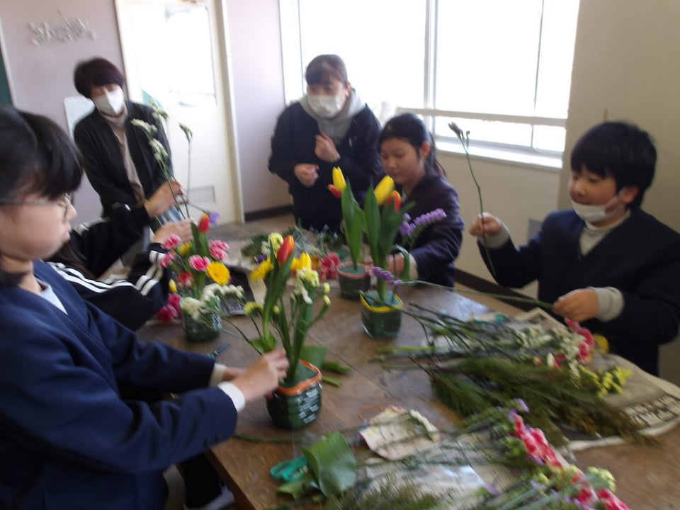 5年生が、「楠若葉」(くすわかば)の皆さんのご指導のもと、フラワーアレンジメントに挑戦しました。今年で20回目になるそうです。一人ひとりがペットボトルの容器に入ったオアシスに花を生けていきます。いろどりや、高さ、花の向きなどを考えながら無心で花を生けていました。出来上がった作品は、どれも本当に素敵で、個性豊かでした。同じ花でも生ける人によって、全然違う作品になります。この素敵な花は、明日の卒業式に飾ります。6年生の門出にぴったりの華やかで素敵なお花が並びます。