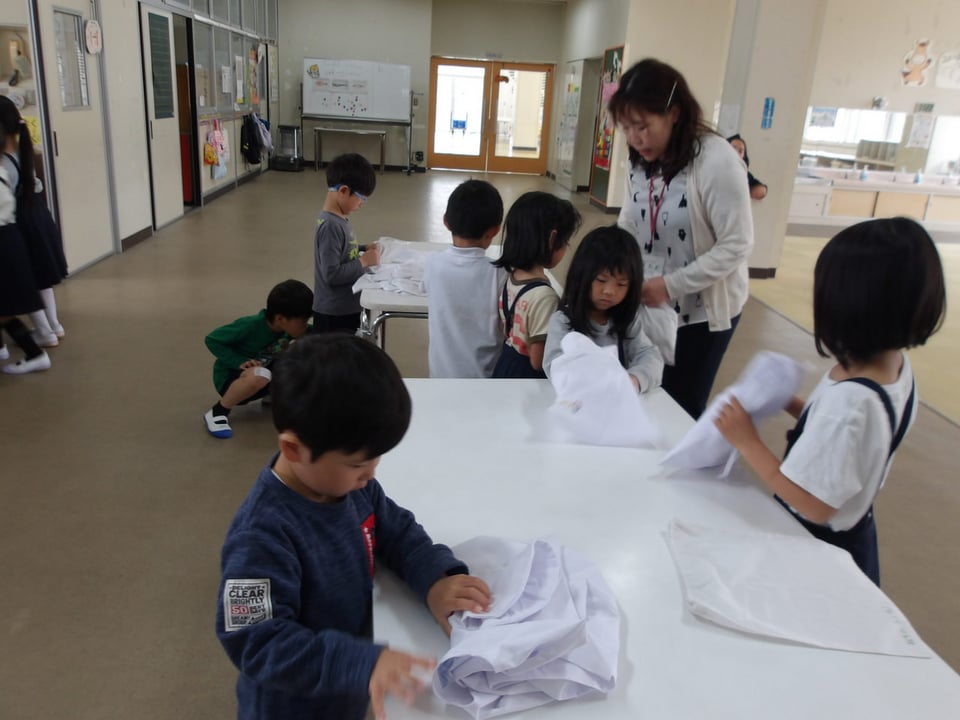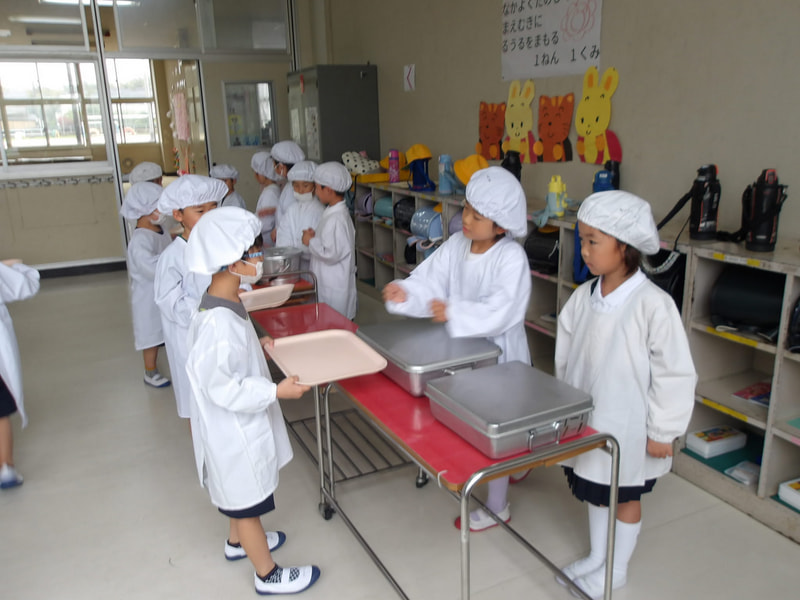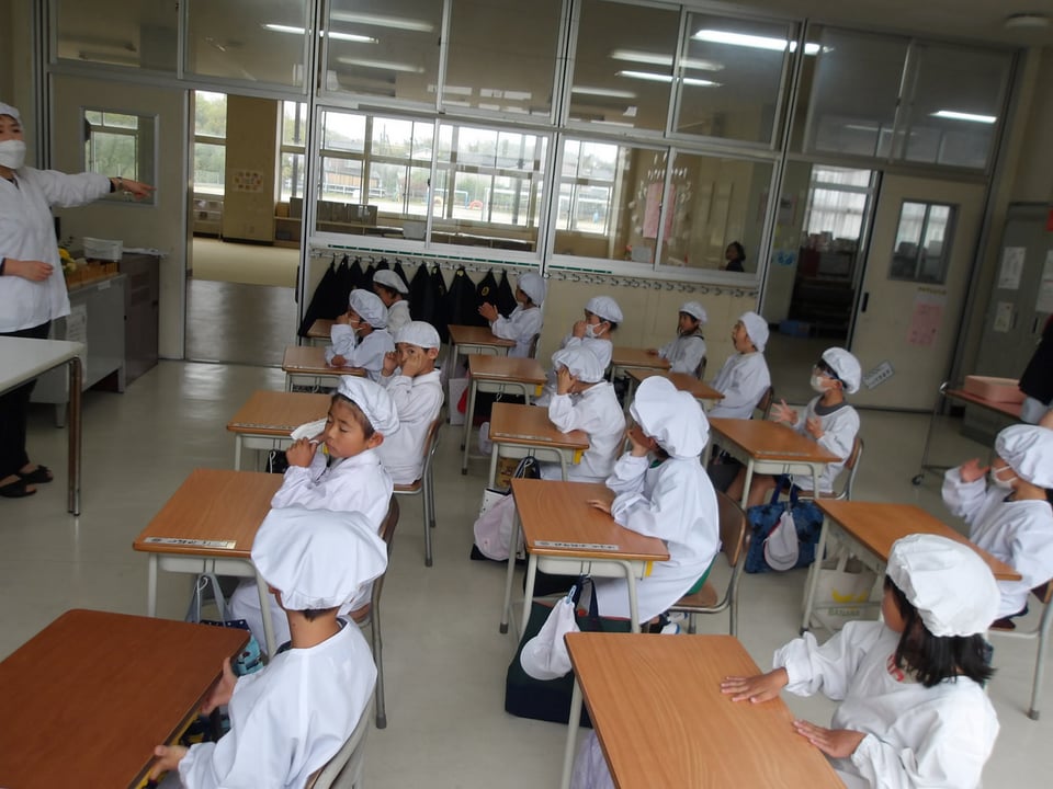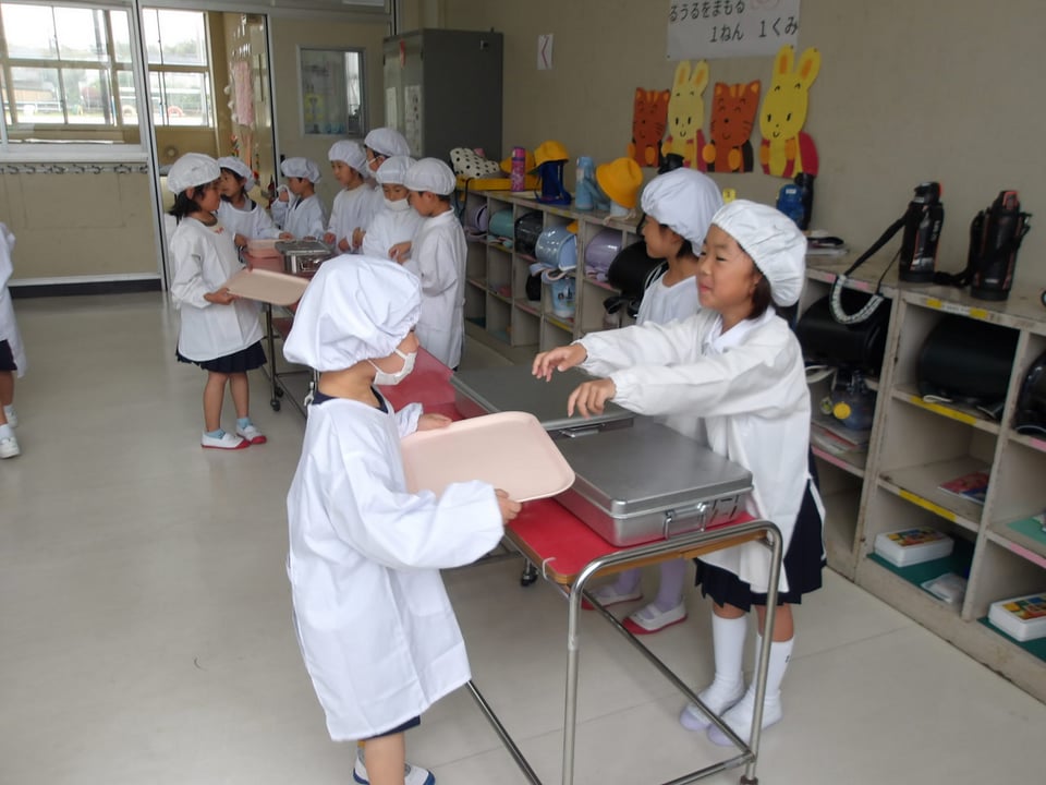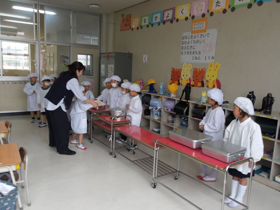 いよいよ1年生の給食が、今日(4月16日)から始まります。昨日は、エプロンの着替え方、給食の配膳の仕方などを勉強しました。1日目のメニューはカレーです!船木小学校での初めての給食、楽しみですね。