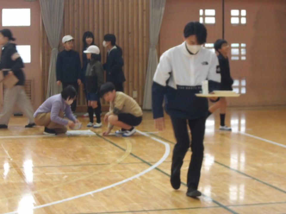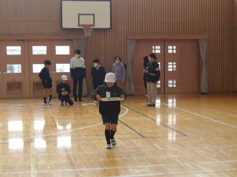 雪の昼休み、外で遊ぶ人もいましたが、今日は体育館では楽しいイベントがありました。それは、体育給食委員会による「おぼん運びリレー」です。給食のおぼんの上に、食器や牛乳パックをのせて走ります。何を載せるかは、くじで決めます。牛乳パックは中身が無くて軽いので走るとすぐに倒れてしまいます。たおれたら直さないといけないので、なかなか速く走れません。先生たちもチームに入り、大激走。とても盛り上がりました。