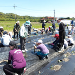 今日、1・2年生が、地域の方々と一緒に、さつまいもの苗植えをしました。 最初に、苗の植え方を教えてもらいました。竹の棒…