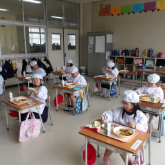 1年生は、今日から給食です!エプロンに着替えて、教室からすぐ近くにあるランチルームに給食を取りに行きました。準備は、先…