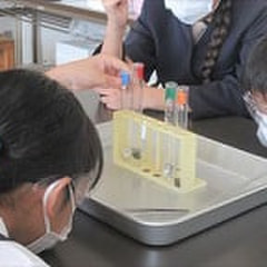 6年生が金属を溶かす液体を観察中。じっくり見ています。1年生は、教務主任の先生に船木小学校のことを教えてもらっています。…