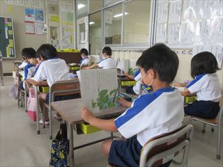 5年生は顕微鏡で植物の花粉を観察していました。みんな、隣からのぞき込んでみたくなる気持ちを我慢して順番に観察していました。