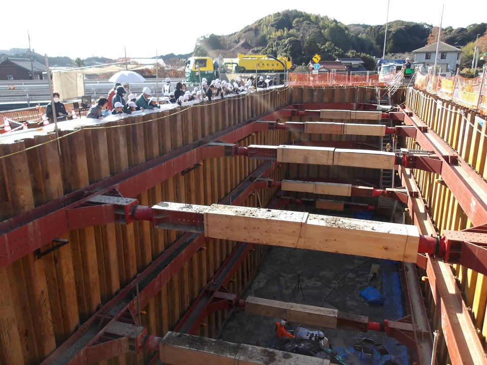 今日、大栄建設の皆さんが、1・2・3年生に、工事現場を見学させてくださいました。「船木大橋」架け替えのための、橋台工事です。昨年は、橋脚、今年は、橋台です。橋を架けるのに、時間がかかるんですね。橋台をつくるために、10m以上の深い穴を掘っておられました。みんな、初めてみたので、その深さにびっくり。ドローンを飛ばして、映像もみせてくださいました。最近は、仮設の橋にイルミネーションを飾ってくださったり、工事の様子をモニターテレビで教えてくださったり、親切にしてくださっているので、今日は、お話ができたり、近くで見たりすることができてよかったです。ちなみに、この工事を発注されているのは、国土交通省ということで、その関係者の方も来ておられました。国道にかかっているからでしょうか?大栄建設の皆さん、国土交通省の方、ありがとうございました。
