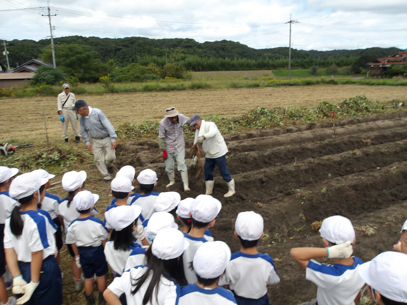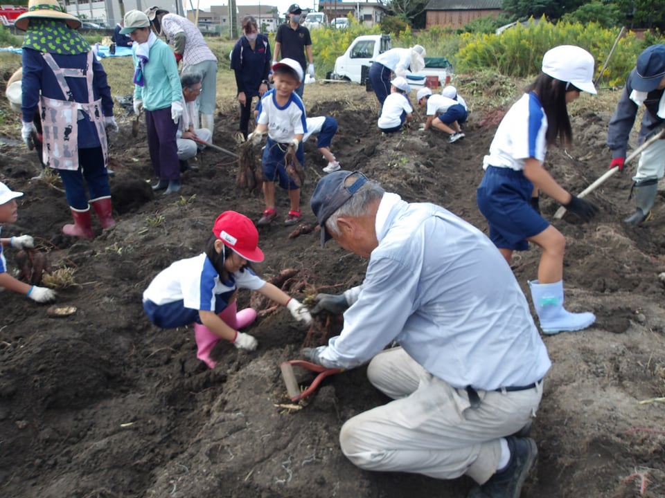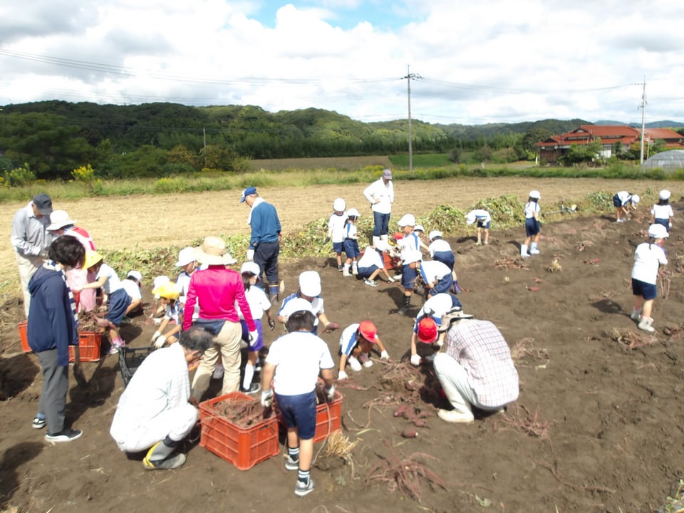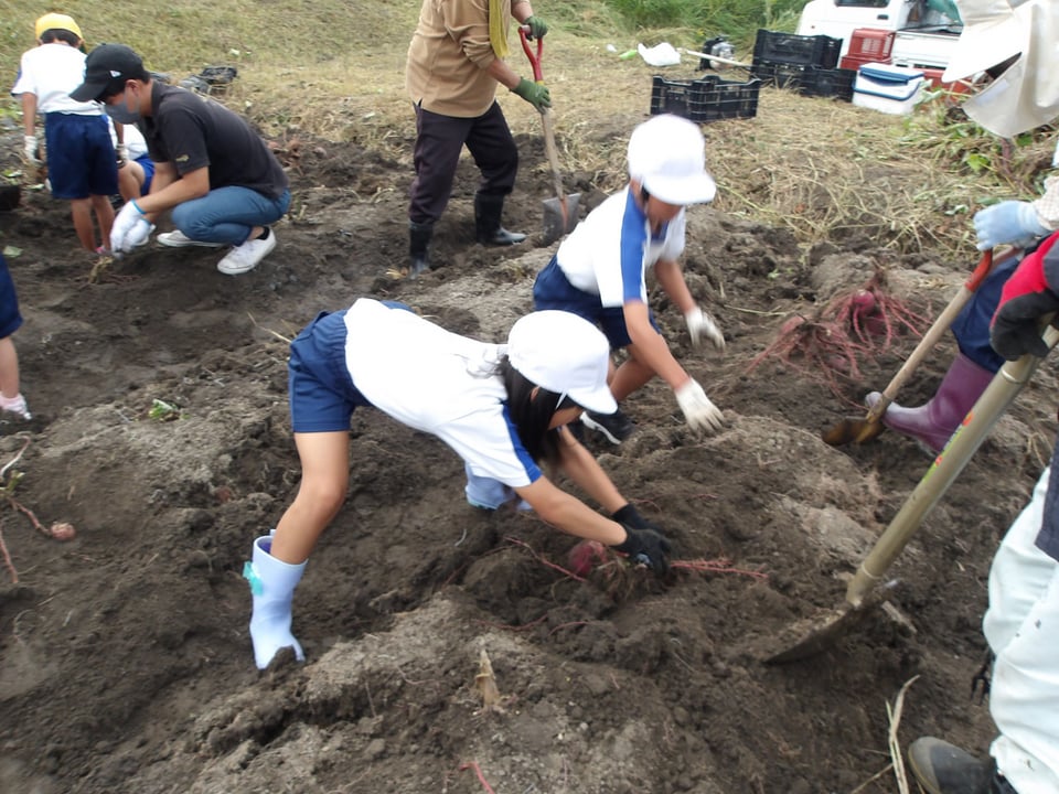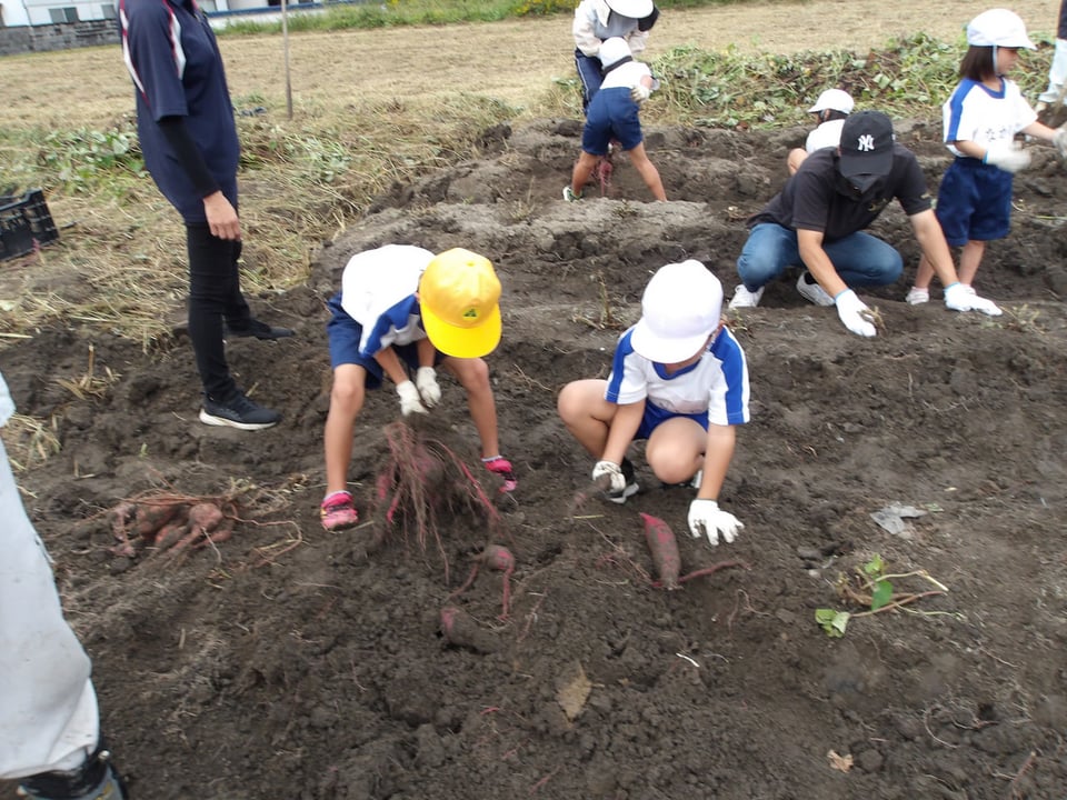 1・2年生が地域の畑へサツマイモを掘りに行きました。5月に植えたサツマイモの苗が土の中でどうなっているのか、土の中にどのくらいお芋ができているのか・・・ワクワクドキドキしながら地域の方と畑を丁寧に掘っていきました。すると・・・「大きい!」「たくさんできてる!」と大歓声!たくさんのサツマイモができていました。地域の皆様と青空のもとで芋堀りができ、大変貴重な体験ができました。地域の皆様、ありがとうございました。