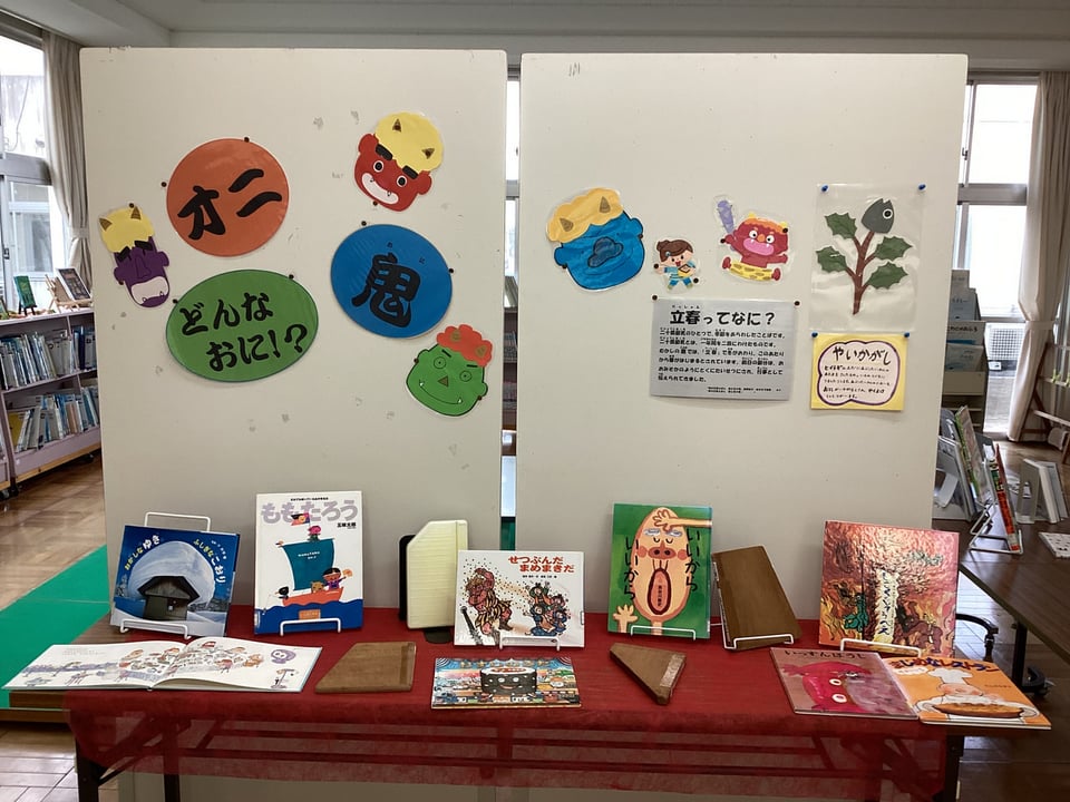 2月の図書コーナーのテーマは、「節分・立春」です。いつも季節感のある図書コーナーをつくってくださる学校司書さんに感謝です。オニに関する楽しそうな本がいっぱい紹介されています。1・2年生のみなさん、どうぞ、手に取って読んでみてください。