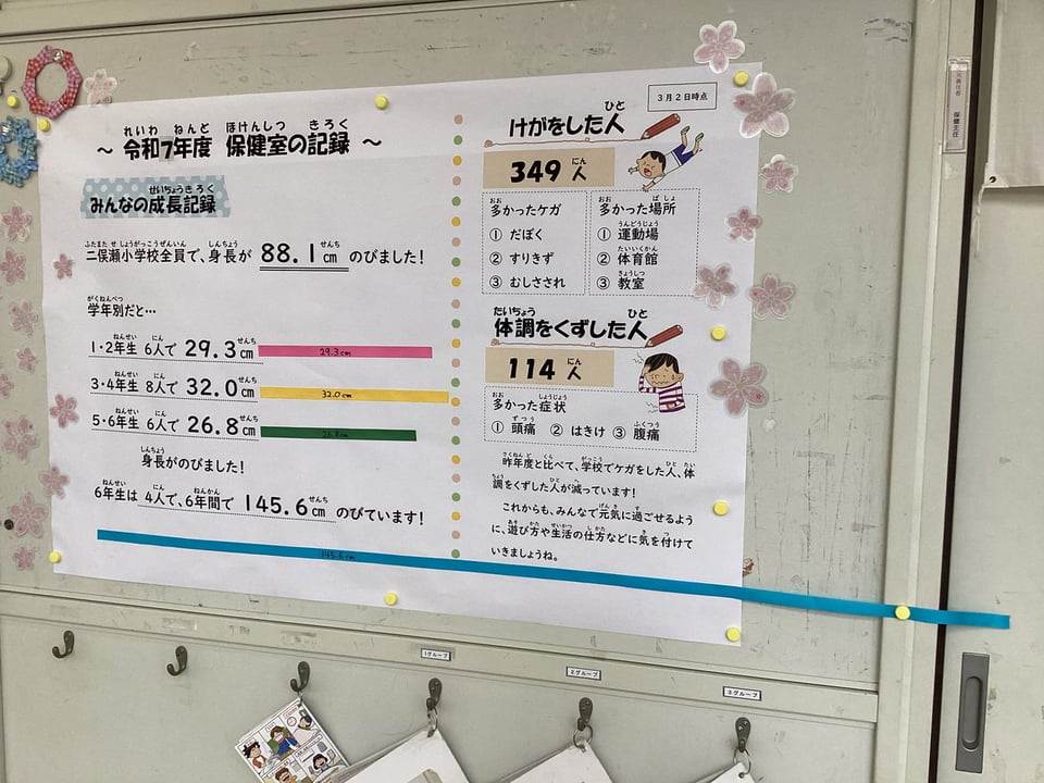 保健室前の掲示板に、今年度の保健室での記録が紹介されています。二俣瀬っ子のみんなの身長の伸びを合計した長さや6年生の6年間での身長の伸びの合計、今年度けがをした人の数・体調を崩した人の数などです。このように、グラフや数値だけで見ると、大きく成長したことやけががたくさんあったことが、一目で分かります。二俣瀬っ子のみんなが、元気にすくすくと斉唱していることが何よりの喜びです。