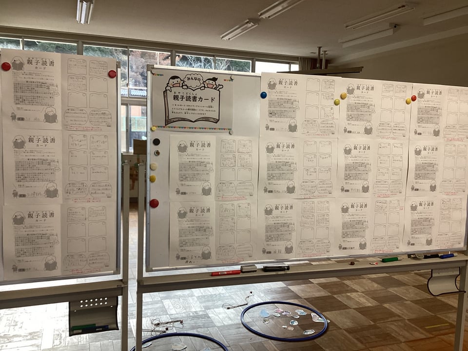昨年11月下旬のメディアコントロール週間に実施した「親子読書カード」を校内に掲示しています。保護者の皆様方、ご協力本当にありがとうございました。この「親子読書」の取組はいかがでしたでしょうか?たまには、親子でともに読書をしたり、親子で本の読み聞かせをしたりするようなひとときもよかったのではないでしょうか?メディア漬けの日々にならないようにするためにも、ときには親子で読書などのような取組も大切にしたいものです。冬休みもあと3日となりましたが、親子でこのような活動に取り組まれるのもよいと思います。