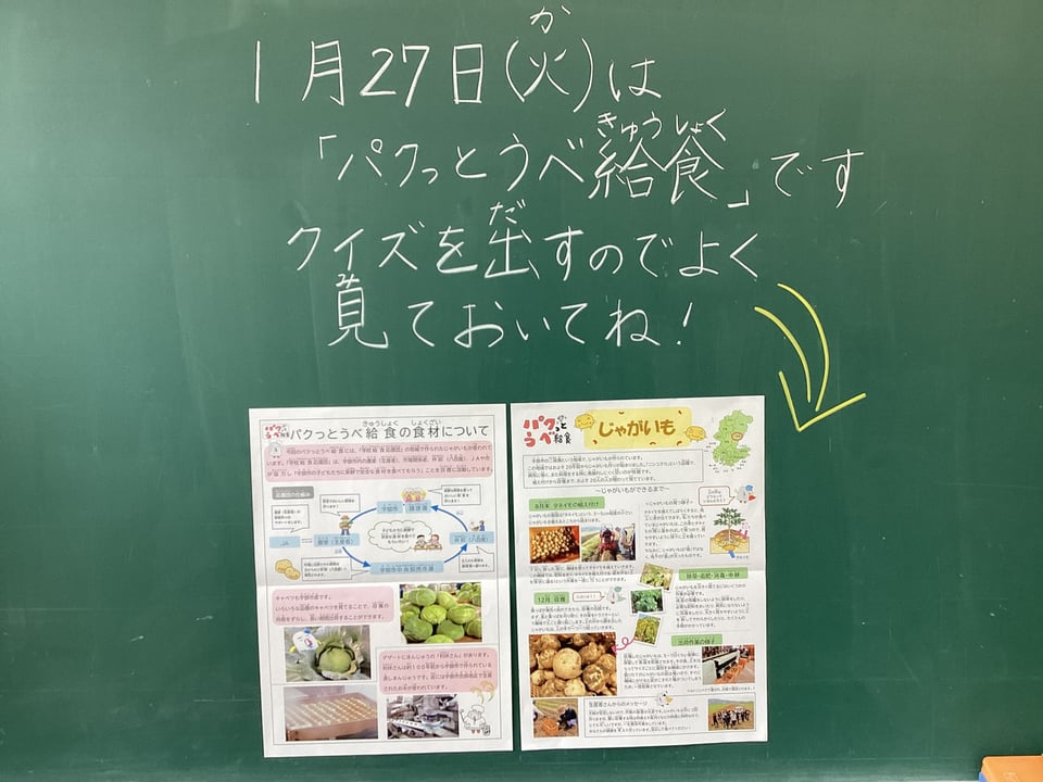 続いて、明日27日の「パクっとうべ給食」の予告掲示物です。明日は、教育委員会学校給食課の皆さんや宇部日報さんが取材にいらっしゃる予定です。