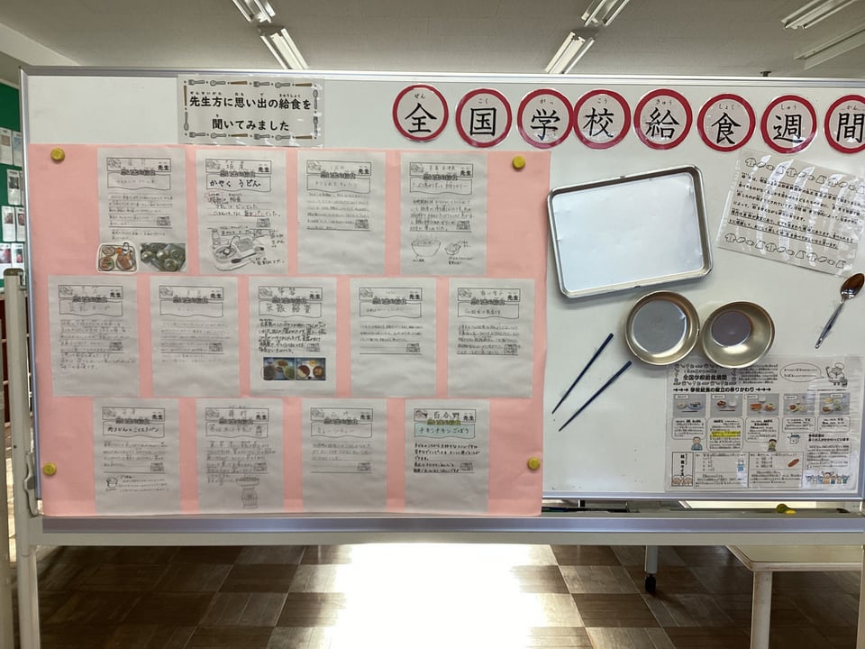 1月24日~30日は、全国学校給食週間です。二俣瀬小では、いろいろな機会を捉えて、この給食週間を盛り上げていこうとしています。まずは、学校給食の歴史に関する掲示コーナーです。先生方の思い出の給食も掲載しています。世代を感じて、おもしろいですよ!