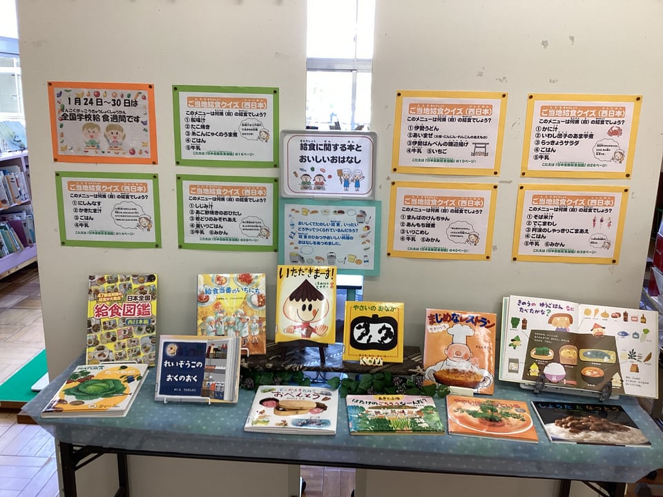 最後に、めだか図書館の図書コーナーの掲示です。学校司書さんが、給食に関する本をたくさん集めて展示してくださいました。この機会に、学校給食のもの知り名人になってくださいね。