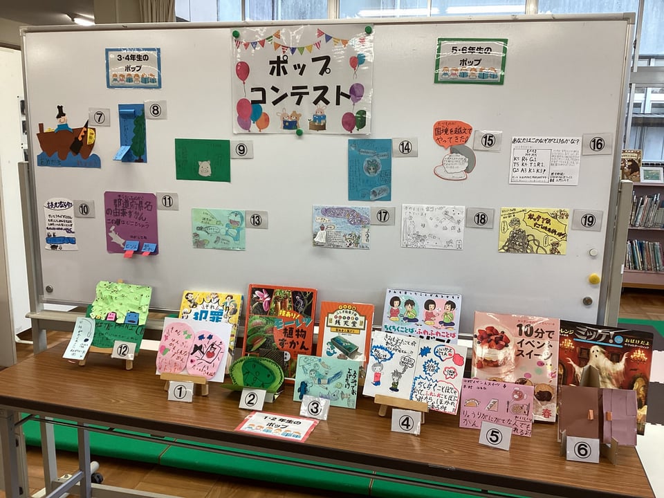 全校の子どもたちが、本の「ポップづくり」に挑戦しました。どのポップも本当に力作ぞろいです。現在、「ポップを見て、その本、読んでみたくなる!」の「ポップコンテスト」を開催中です。さて、どのポップが選ばれるでしょうか?全校の児童&教職員が投票しています。結果がとても楽しみです。すべてのポップが、すでに「がんばり賞」ですが・・・!