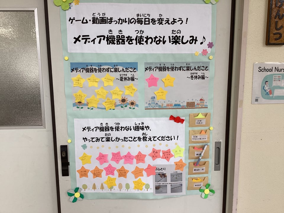 子どもたちのメディアコントロール力を高めるために、保健室前に子ども参加型の掲示物が展示されています。これは、生活調査結果から明らかになったもので、子どもたちのゲーム・動画ばかりの毎日を変えるための一つの手段です。子どもたちが実際に家庭でやっている「メディア機器を使わない楽しみ」を、子どもたちが自由に付箋紙に書き、貼っていくというものです。自分が家庭でやっていることをみんなにどんどん紹介したり、友達の取組のよさを自分の家庭でも試したりしてみてください。このことが、みんなのメディアコントロール力を高めていくことにつながります。