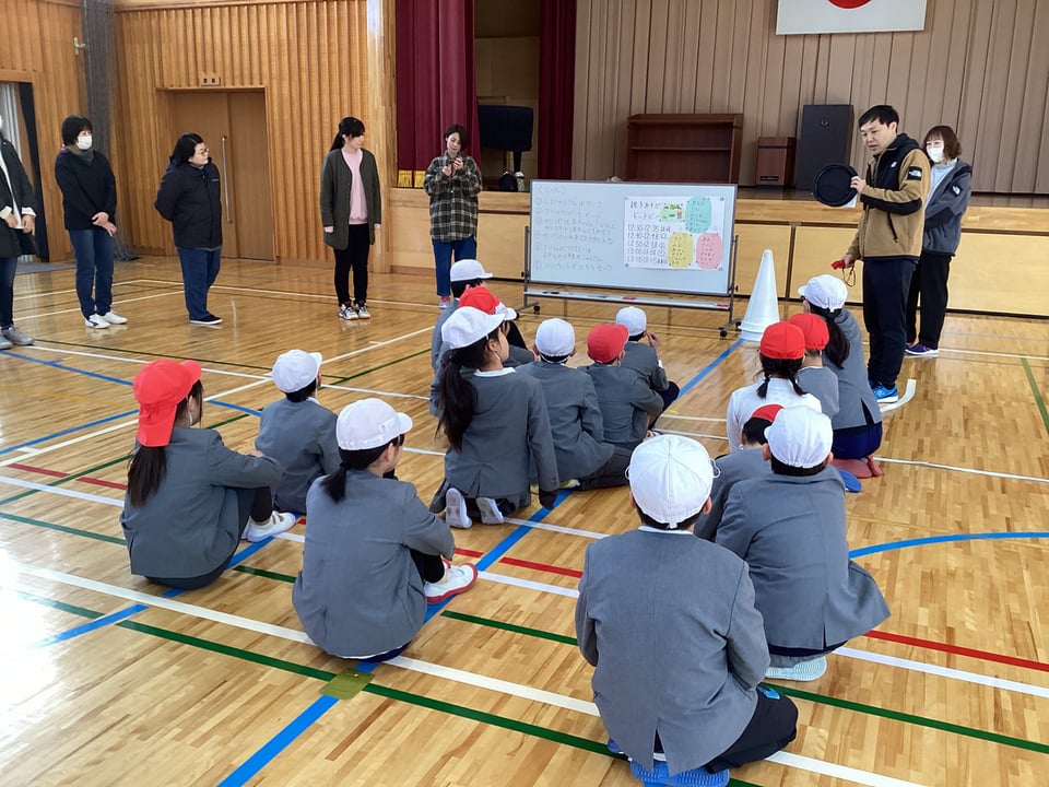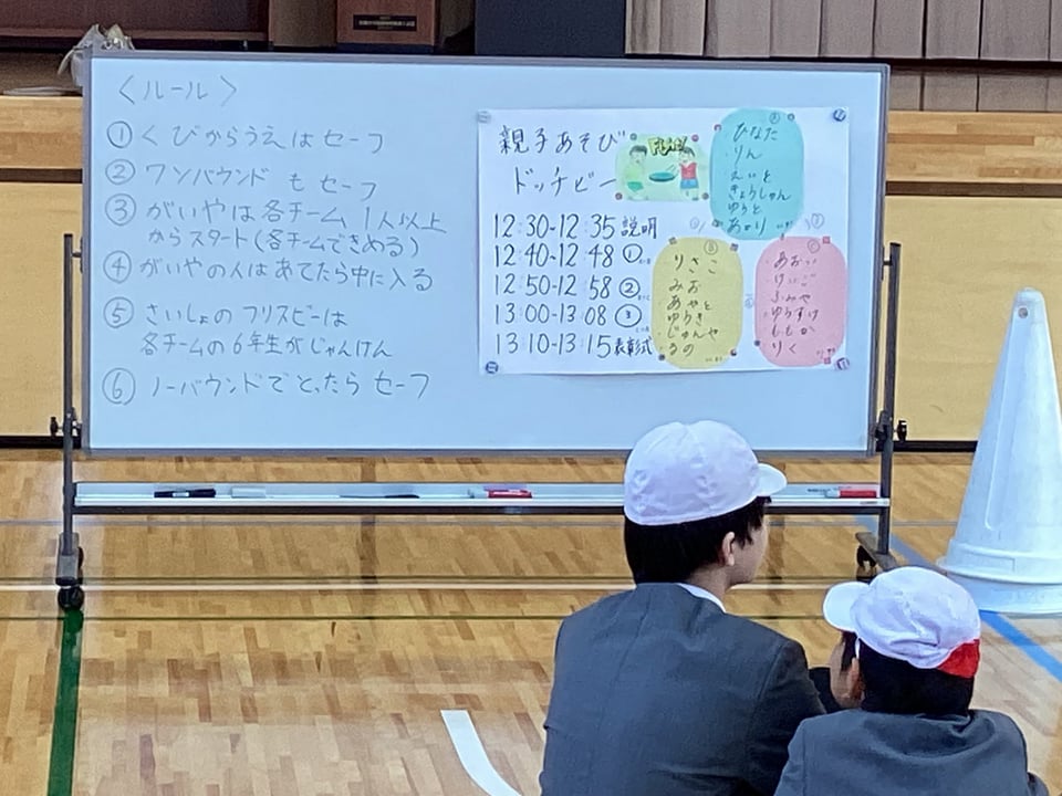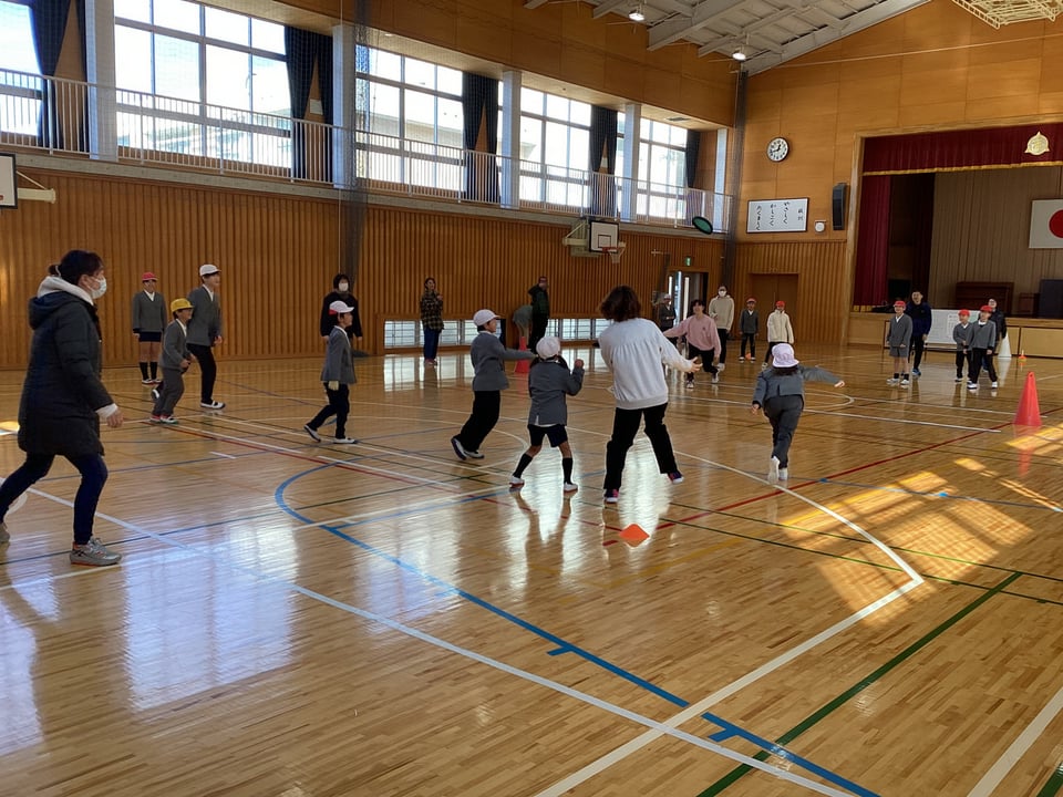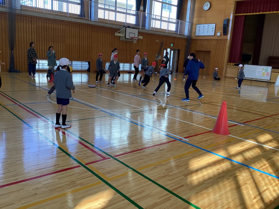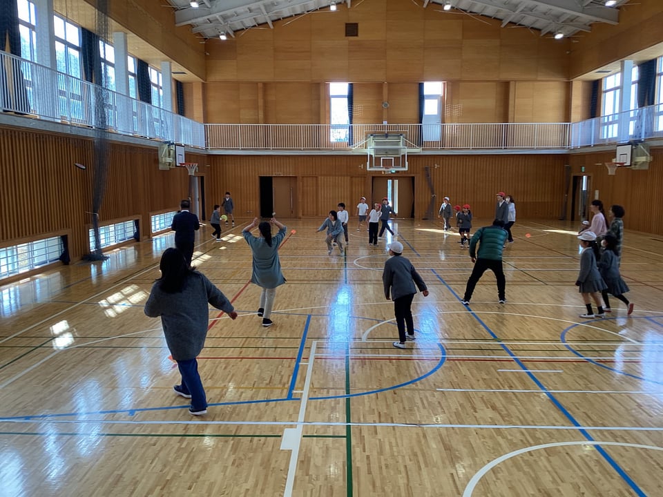 1月15日の参観日前の昼休みに、親子ふれあい遊びを実施しました。今回の保護者当番のみなさん、当日までの準備、本当にありがとうございます。事前に3グループに分けた班編成や設定したルールに沿って、総当たり戦を行いました。この「ドッヂビー」は、学年差や子ども・大人に関係なく、楽しめるところがよさです。子どもの方が上手かもしれません。保護者のみなさんのご協力により、親子でふれあい、楽しみながら運動する機会となりました。ありがとうございました。