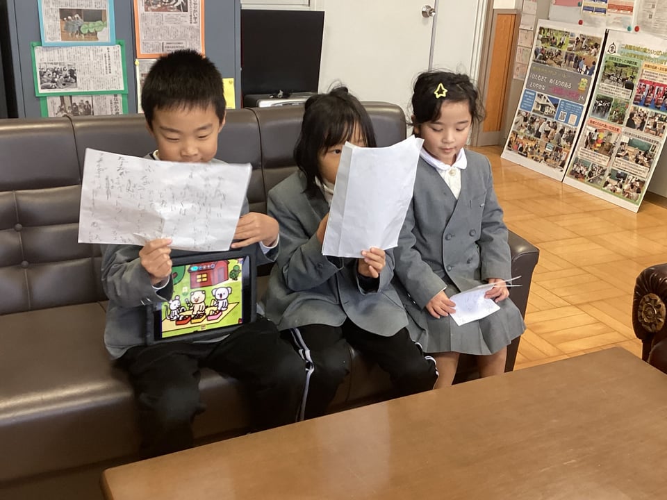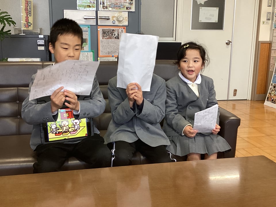 1年生が突然、校長室にやって来ました。聞いてみると、「お話を創ったので、聞いてほしい」ということでした。その絵を見せながら、自分たちで創作したお話を音読してくれました。驚いたのは、その音読の仕方です。一人ひとりが声優さんのように、登場人物になりきって、楽しそうに音読してくれたからです。見事な音読と、よく考えられたお話に「はなまる」をあげました。1年生のみなさん、すてきなプレゼントをありがとうございました。