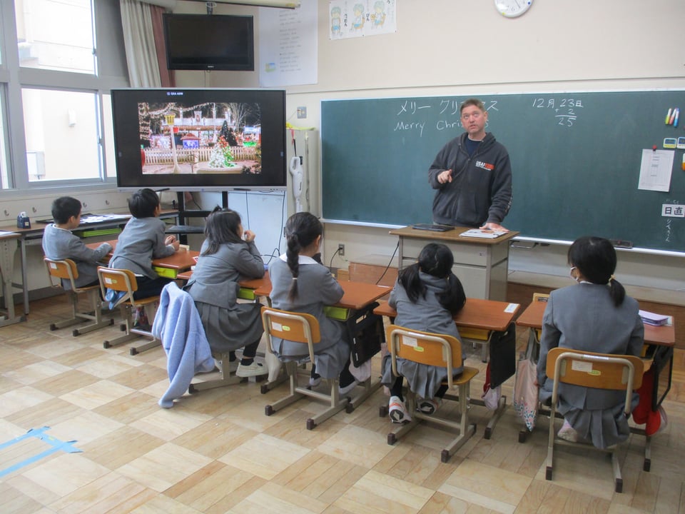 12月23日、1・2年生の外国語活動は、ALTが外国のクリスマスのお祝いの仕方についてお話してくださいました。子どもたちは、日本と外国のクリスマスのお祝いの仕方の違いについて知ることができました。同じクリスマスでも国によってお祝いの仕方に違いがあるのですね。