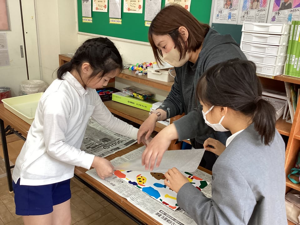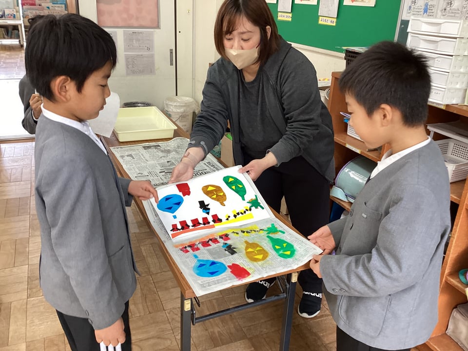 1・2年生が図工で「カラー紙版画」にチャレンジしました。絵の具のしみ込んだカラー紙を自分の好きなキャラクターや模様で形作り完成させた台紙に、水を含ませた紙をのせて、自分が作った絵を写し取ります。この版画に初めて挑戦した子どもたちからは、「わあ!すごい!」「きれい!」と言った喜びの声があがりました。このカラー紙版画にとても満足気でうれしそうな子どもたちでした。カラー紙版画を成功させることができて、よかったですね、1・2年生のみなさん!どれもみんなすてきな作品ばかりでしたよ!