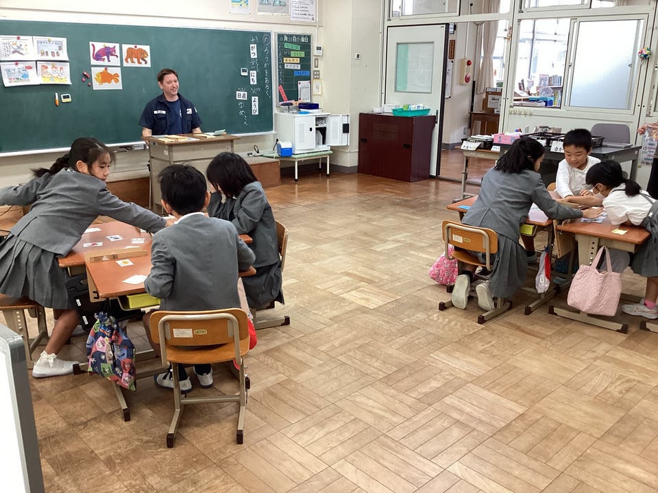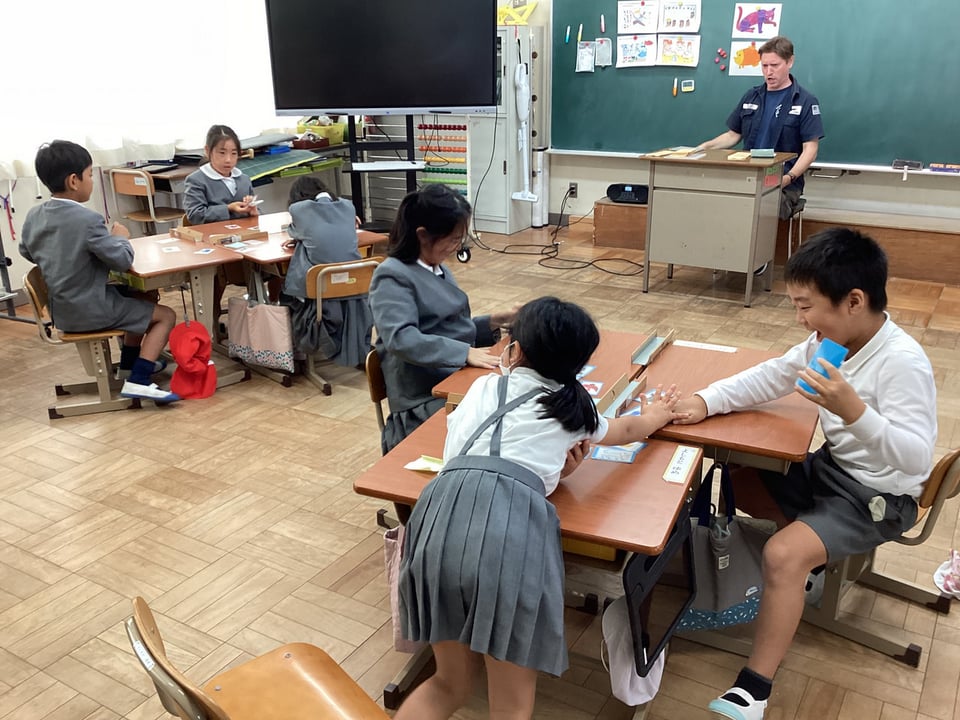 1・2年生の外国語活動の様子です。この日は、「動物・色カルタをしよう!」を行いました。グループごとのカルタについて、ALTが英語で動物の名前や色に関するヒントを出して、子どもたちがそれに当てはまるカードを取り合うゲームです。子どもたちは、集中してALTのヒントを聞き、それをもとに予想しながらカードを取り合いました。笑顔と歓声のあふれる大盛り上がりのゲームとなりました。