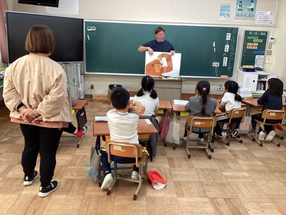 1・2年生の外国語活動では、ALTに英語の絵本の読み聞かせを行ってもらいました。もちろん、日本語で説明したもらったり、絵に関係する動物やその色などを英語で言い合ったりしながら、子どもたちも絵本の読み聞かせに参加できるよう、工夫してくださいました。子どもたちは、英語の絵本の読み聞かせを聞くだけでなく、その絵本の世界に入り込んで発音したり、動物の鳴き声の真似をしたりしながら、読み聞かせを楽しむことができました。