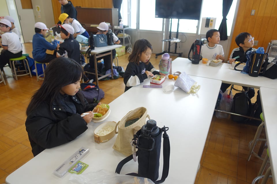 体育で動き回った後は、お楽しみのお弁当です。お家の人が朝早くから作ってくださったお弁当を、みんなでお話しながら楽しくおいしく食べました。やっぱりお弁当は特別な味で、最高です。お家のみなさん、本当にごちそうさまでした。今回の集合学習を通して、他校の友達との関わりをさらに深めることができました。