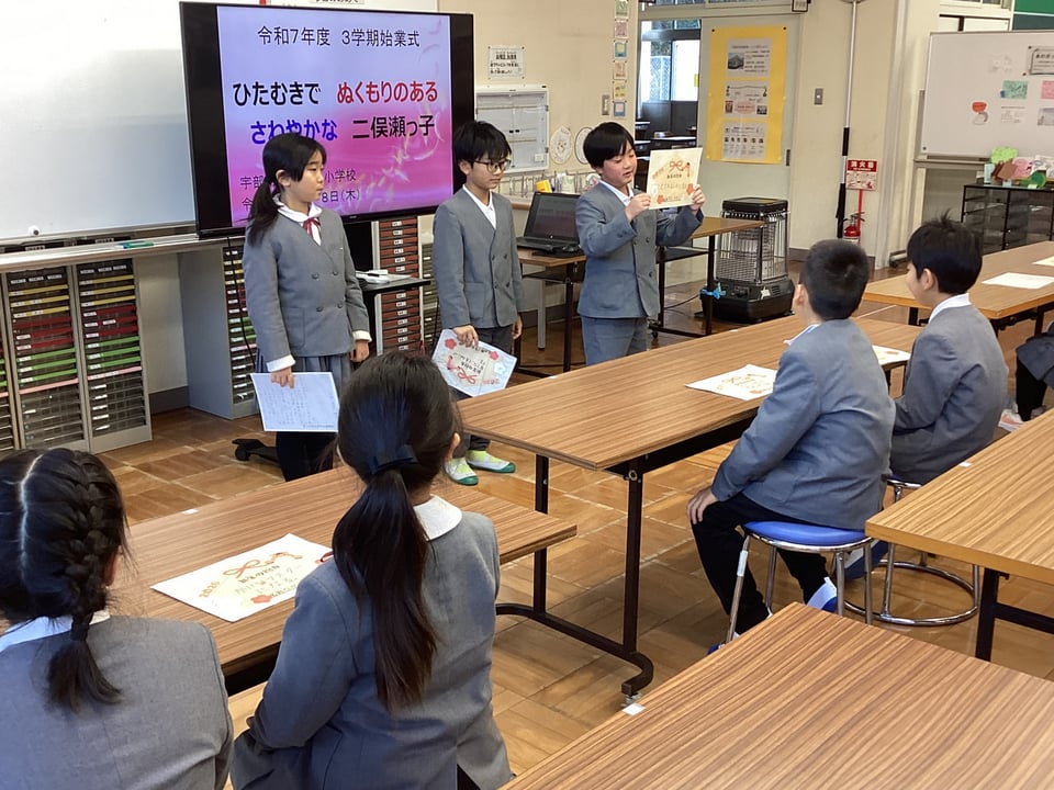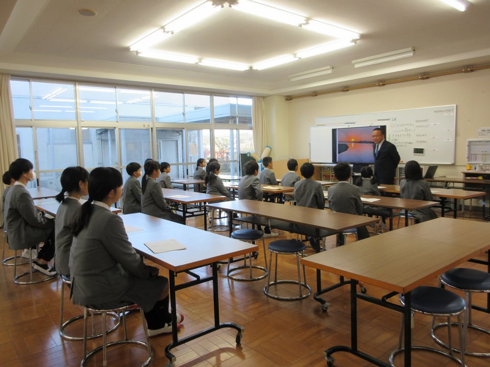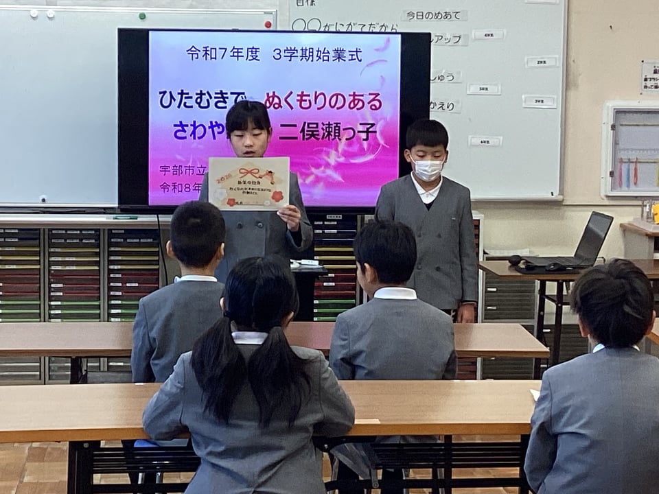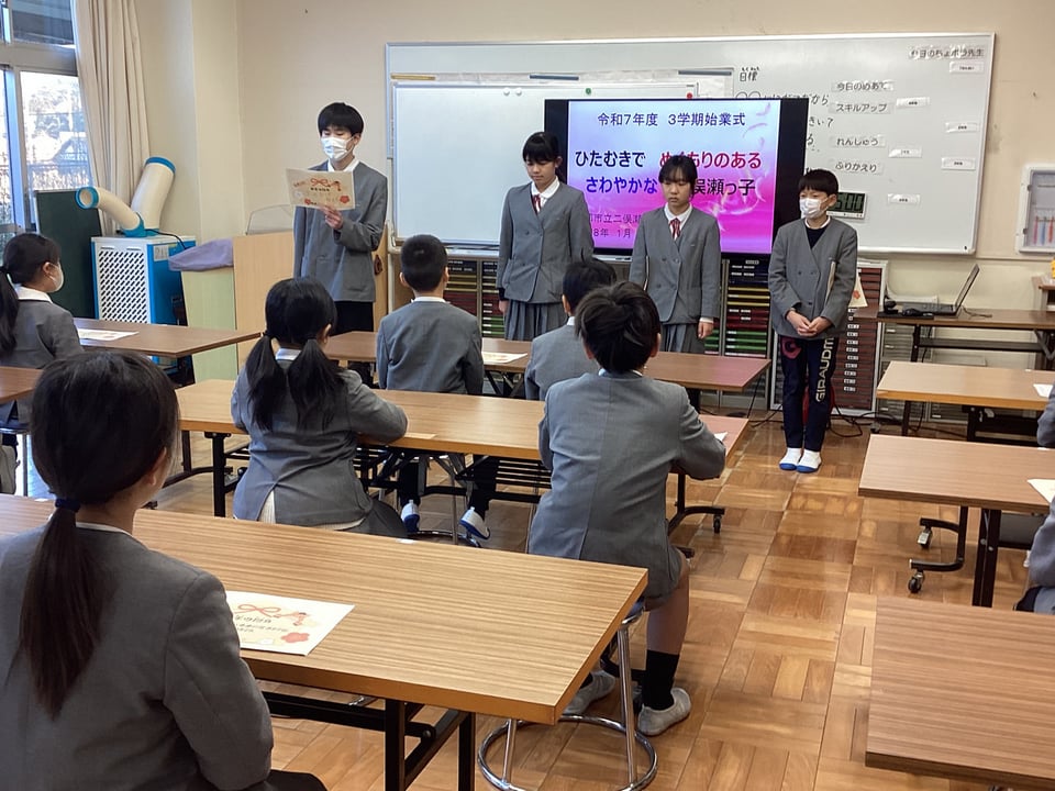 校長からは、「2026年丙午の年の話」と「思いやり・感謝の心は努力して育てるもの」の2つの話をしました。「『こころ』は見えないが、『こころ づかい』は見える。『思い』は見えないが、『思いやり』は見える。」この短い言葉が実行できれば、二俣瀬地域のみんなが温かい気持ちになれるはずです。最後には、さわやかに「校歌」を斉唱して、3学期のスタートをきりました。みんなで前に向かって挑戦することで、自分を成長させる1年にしていきましょう!