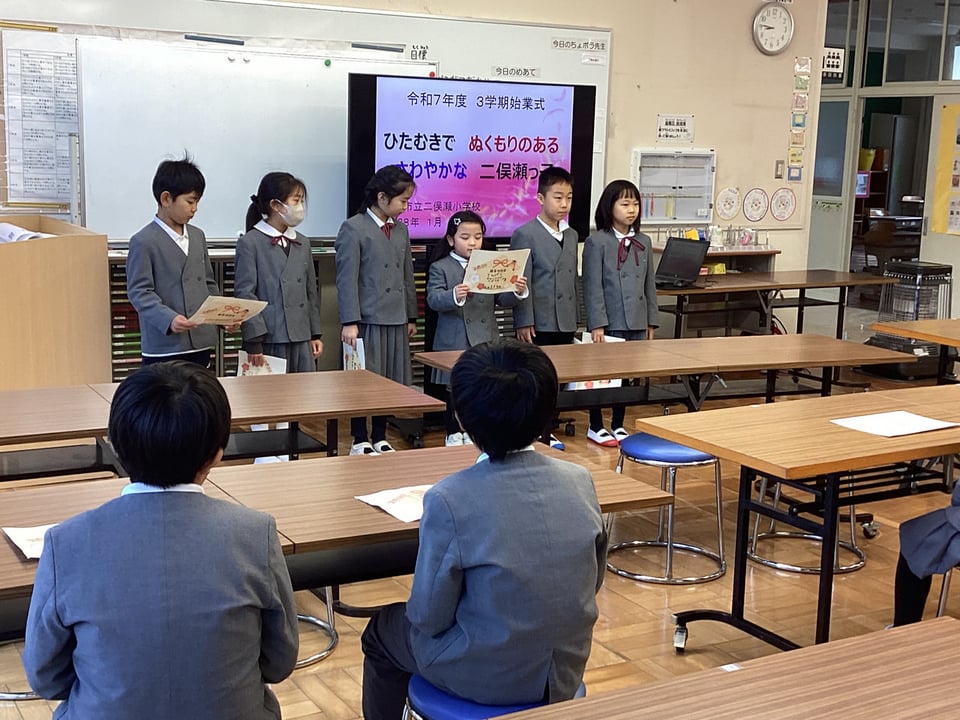 1月8日、清々しい気持ちで3学期始業式から学校生活がスタートしました。まずはじめに、各学年の子どもたちからの「新年の誓い発表」から始まりました。感心したのは、各学年の発表内容です。自分の今の状況をしっかりと見つめていること、そして、そこから改善したいこと・その理由をきちんと発表できていることです。話す姿勢や声の大きさも見事でした。今年の二俣瀬っ子は一味違います。期待感が大きく膨らみました。