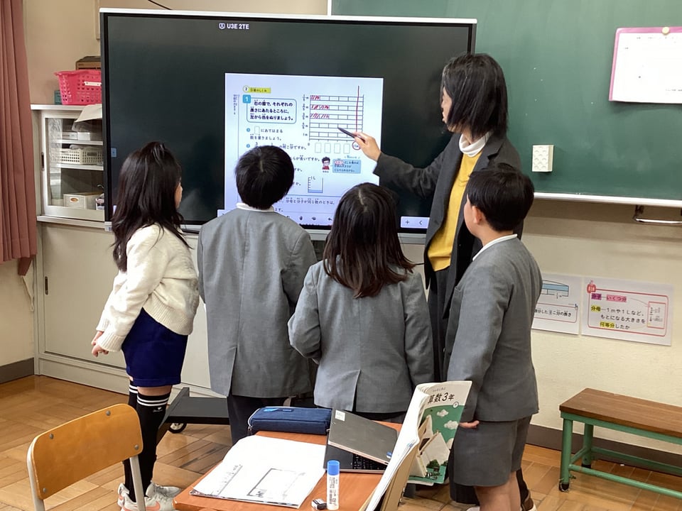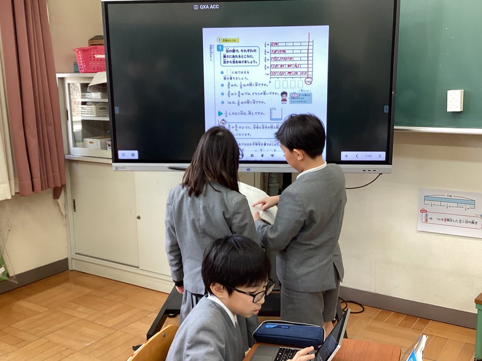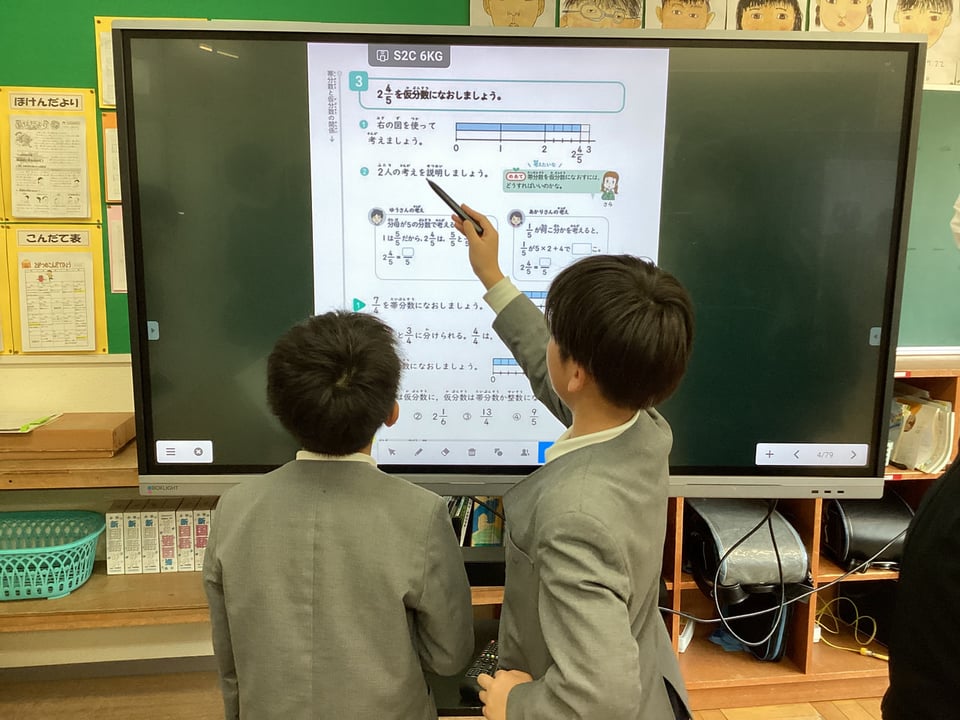2月4日、やまぐち総合教育支援センターから講師を招いて、3・4年算数の自由進度学習の校内研修会を開催しました。授業の内容は、3年「分けた大きさの表し方やしくみを調べよう」、4年「分数の大きさや計算のしかたを考えよう」です。子どもたちは、分数の大きさ比べの仕方や、帯分数と仮分数の表し方について、見方・考え方のポイントを教師から学んだり、友達同士で説明し合ったりしながら、主体的に学び合うことができました。本時の目標を達成するために、学び方を自分で選択しながら、学びの成果を懸命に伝えようとする姿がすてきでした。仲間とともに教え合い、学び合う姿が確実に高まってきています。