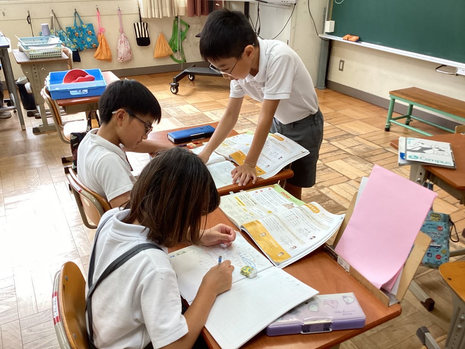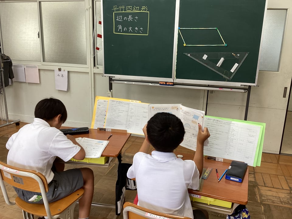 3年生は、単元末のまとめ問題に挑戦していました。友達に相談したり、互いに教え合ったりする姿がとてもすてきでした。互いに教え合い、学び合って、みんなでかしこくなっていきましょう。4年生は、平行四辺形の図形の特徴について調べていました。定規や分度器を使いながら、辺の長さや角の大きさを調べ、共通点や相違点を見つけることができました。辺や角に関する平行四辺形の特徴を発表し合い、自分たちでまとめることができました。3・4年生にも自ら主体的に学ぶ習慣が身に付いてきています。
