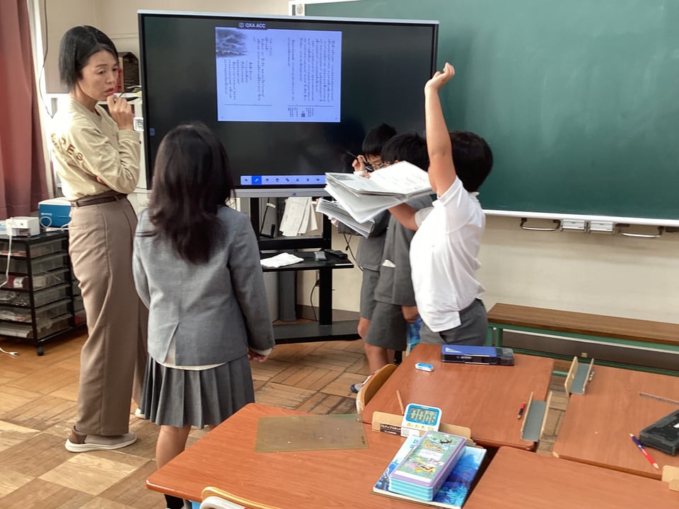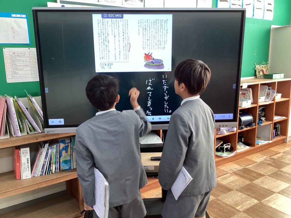 3・4年国語の物語文学習の様子です。3年は「ちいちゃんの かげおくり」の学習を行っています。子どもたちは、電子黒板に映し出した教材文をもとに、主人公ちいちゃんの気持ちや様子の変化を読み取り、自分の考えを発表したり電子黒板に書き込んだりしました。4年が「ごんぎつね」の学習を行っています。子どもたちは、電子黒板の教材文に書き込みをしながら、ごんの気持ちや性格などをについて話し合いました。互いの意見を電子黒板に書き込みながら学習を進めることができました。