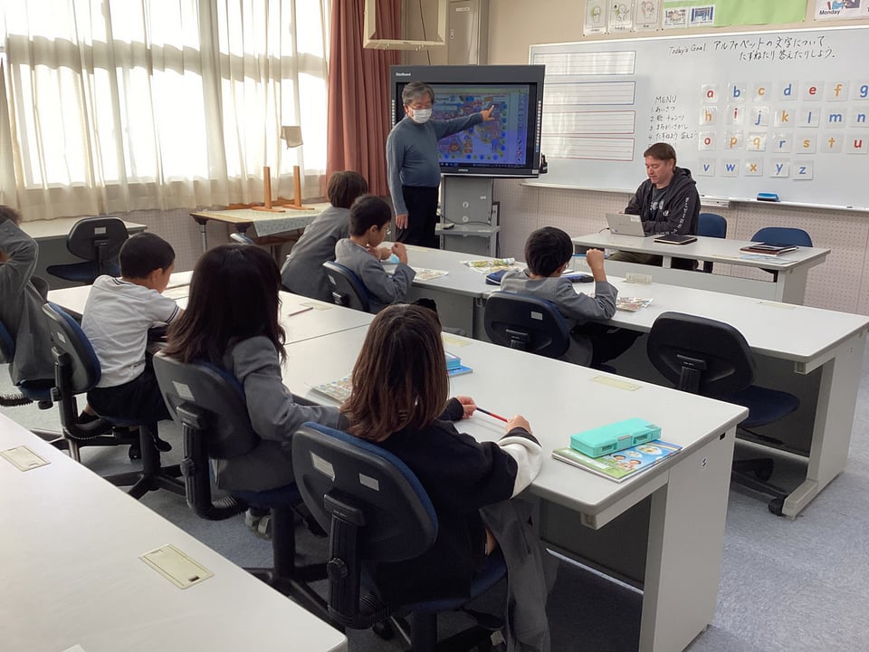 3・4年生は、外国語活動でALTといっしょに「アルファベットについて、たずねたり答えたりしよう!」というめあての学習を行いました。3・4年生では、アルファベットに慣れ親しむいろいろな活動を行います。この日は、絵の中に隠れているアルファベットやそのアルファベットに関係する言葉を見つけたりしました。子どもたちは、遊び感覚でアルファベットの形と、それに関係するものの英語での言い方をつなげて覚えていくことができました。