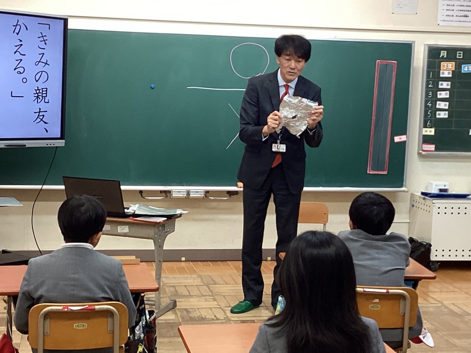 12月3日、3・4年生は、宇部市教育委員会の学校安心コーディネーターによる「学校安心に関する講話」を聞きました。今日の3・4年生は、いつも以上に真剣で集中した表情で授業に臨みました。本日の講話のキーワードは「値打ち」です。自分の人としての「値打ち」を上げようということです。そのために、やってよいこととよくないことに対して、毅然とした態度で「一線を引く」ことを大切にしてほしいということでした。そこで、私たちが何気なく用いている「言葉」が大切になります。その「言葉」の重要性を、絵本「わたしの いもうと」と「お手紙」を使って語り掛けられました。また、「言葉」は使い方によっては、鋭い針のようなものになり、人の心を簡単に傷つけてしまうことを、アルミホイルとペンで実演されました。