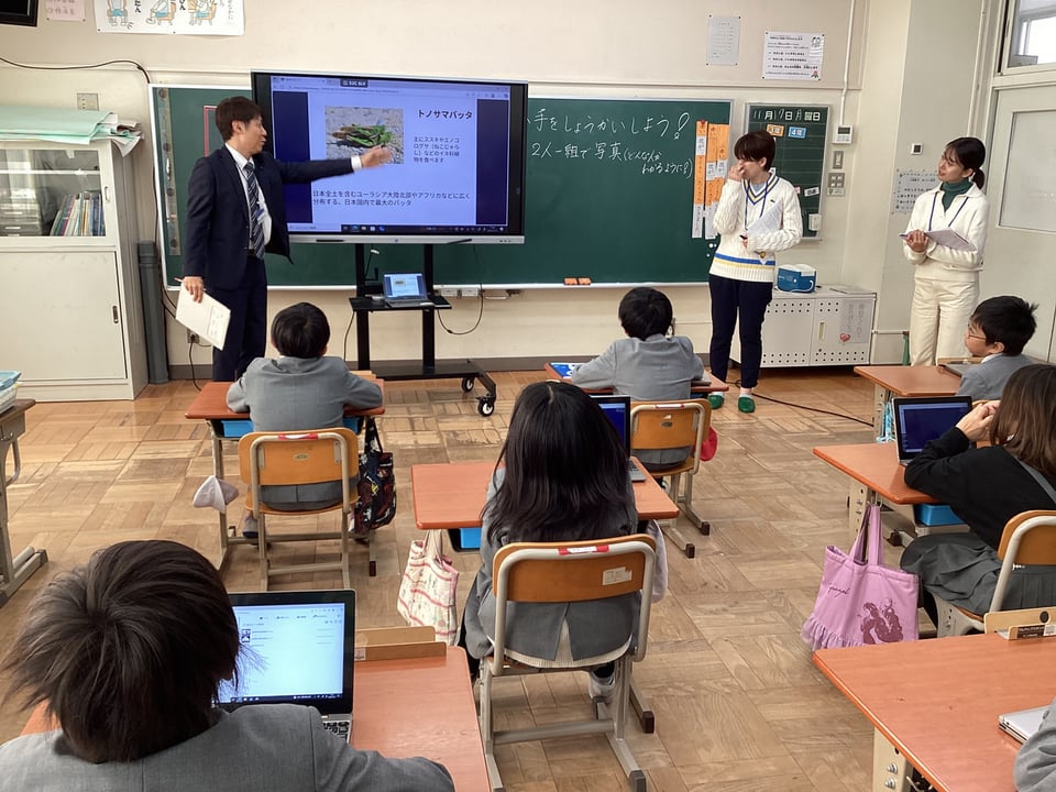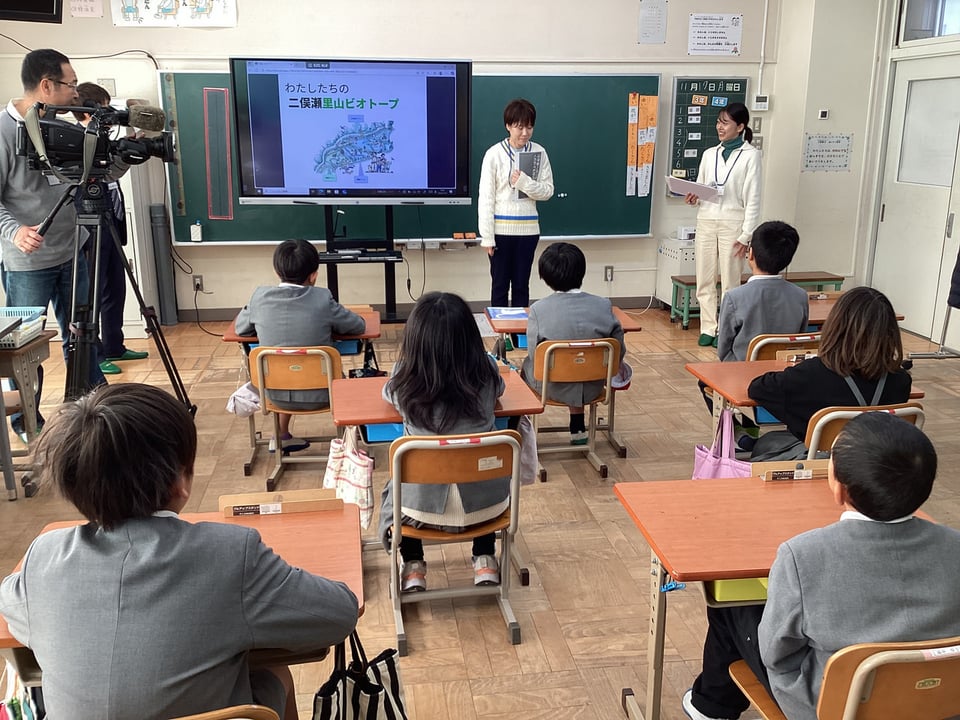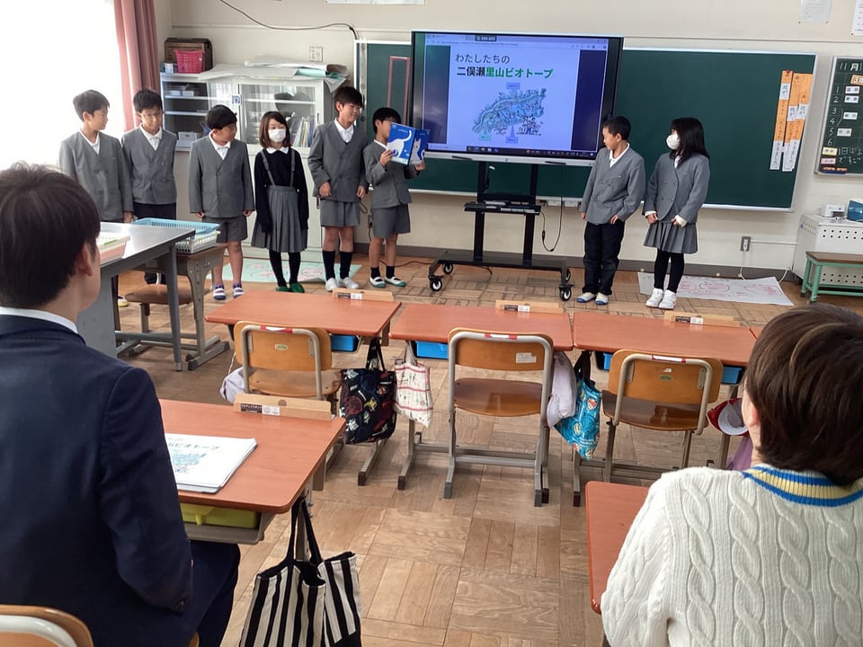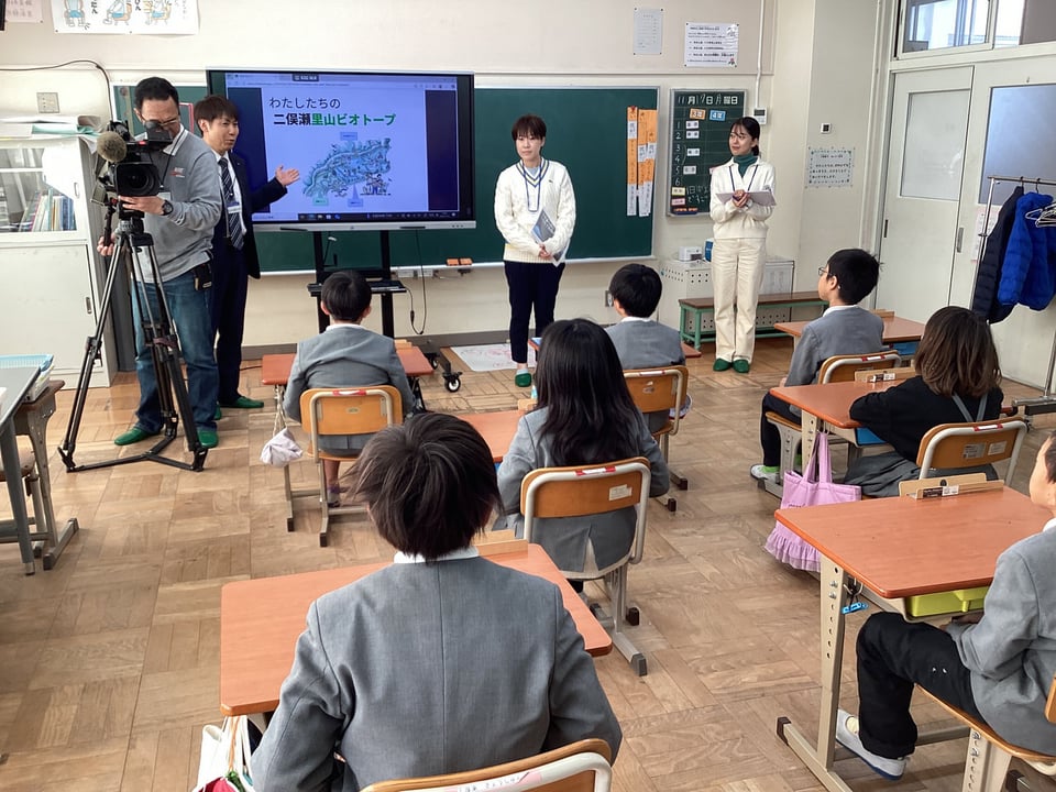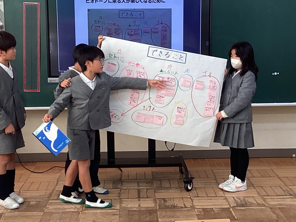3・4年生は、ビオトープをそこを訪れる人にとって、また、そこで暮らす生き物にとって、「楽しい場所」にするために、「案内板づくり」「ビオトープにいる生き物」「ビオトープの敵となる外来生物」の3つについて、スライドや大判用紙を用いて発表しました。KRYのみなさんからは、分かりやすいプレゼンを評価いただきましたが、「誰に・何を・どのように」伝えようとしたのかを明確にしてほしいという気付きをいただきました。また、その目的や方法に合った「写真や文字」情報が相手に伝わるような工夫をしてほしいという宿題をいただきました。