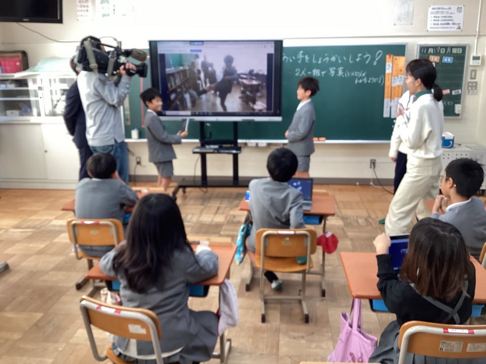 次に、演習として、ペアで写真を取り合って「相手のよさを紹介しよう」という活動を行いました。子どもたちは悩みながらも、好きなことの動作を付けたり、ものを持ったりした写真を撮影し、互いのよさを紹介し合いました。この演習は、自分が伝えたいことによって「どのような写真を使うのか」が大切ということを学ぶためのものでした。子どもたちは、情報となる「写真」や「文字・言葉」の重要性に気付くことができました。