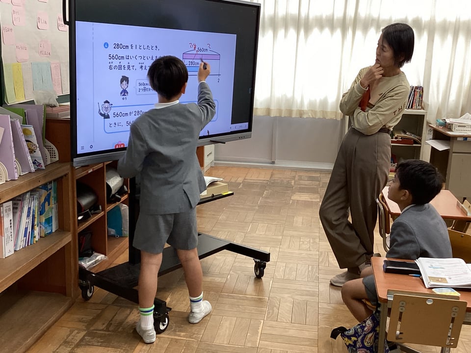 4年算数の学習の様子です。4年生は難関単元の一つ、割合の見方・考え方につながる「倍の計算について考えよう」の学習に取り組んでいます。子どもたちは、テープ図を使った数直線図を使って、立式の根拠を説明し合う活動に取り組んでいました。テープ図を入った数直線図をもとに、倍関係にある数量について説明していました。このような学習が「割合の見方・考え方」につながっていくので、繰り返し学習を積み重ねていきたいと思います。