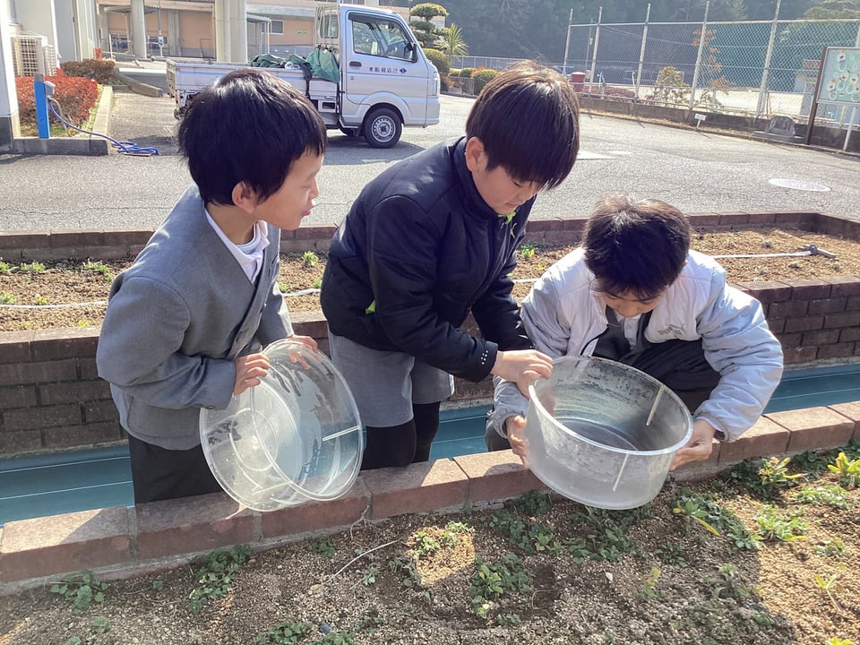 4年生は理科で「水の三態変化」について学習をしています。この日は朝方が寒い日だったので、「外に出した容器が白い水滴でくもったのはどうしてか?」について考える学習を行いました。子どもたちは、地中の空気(気体)が容器に付き、冷やされて水滴(液体)になったことを上手に説明することができました。実際に指で容器面をさわりながら、水になっていることを確かめていました。
