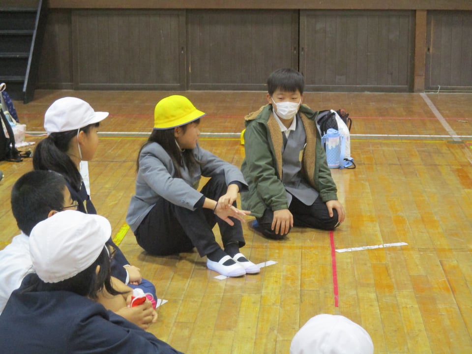 5年生の授業①では、アイスブレイクとして「仲間づくりゲーム」からスタートしました。3校の5年生は宿泊学習ぶりに会いますが、もうすっかり気ごころが知れた仲です。みんなでわいわいとにぎやかにゲームを楽しみました。このような姿は、これまでの合同学習・集合学習の成果といえます。