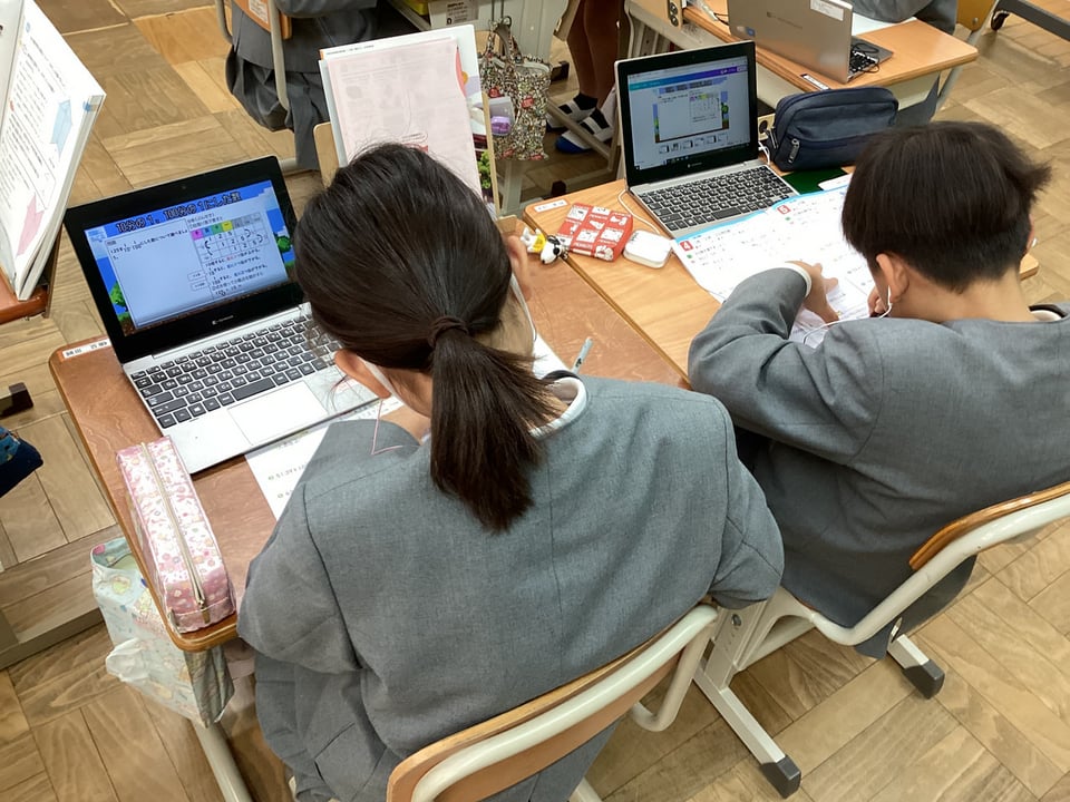 5・6年生は新学期早々から「単元内自由進度学習」にチャレンジしています。算数科では「クエスト型自由選択学習」として、提示されたメニュー表にしたがって、自分なりの目標を決め、学習方法を選択して学習を進めています。動画をヒントにしながら自力解決したり、分からないところを友達や教員に質問したりして、学習に取り組んでいます。学習の最後には、本時の振り返りをして、次の時間の目標も決めています。この取組が、5・6年生のどのような主体的な学びを引き出し、子どもたちにどのような学ぶ力を付けていくのか、今後が楽しみです。