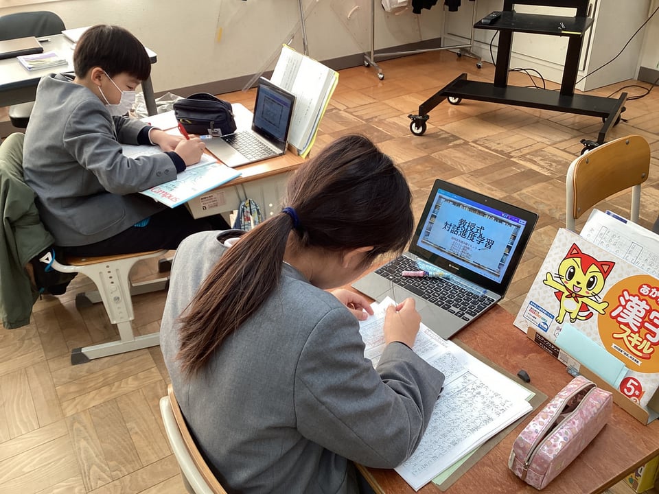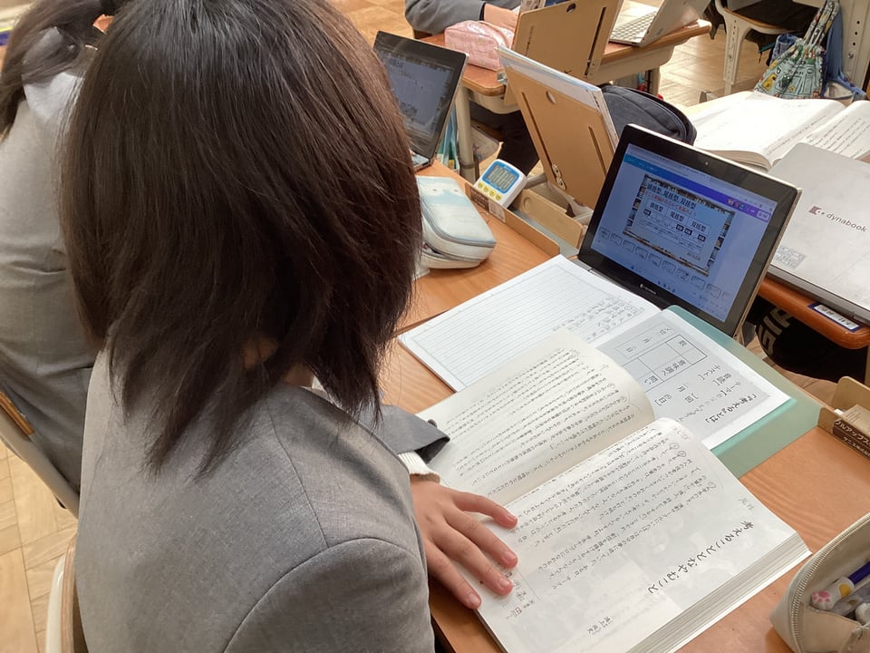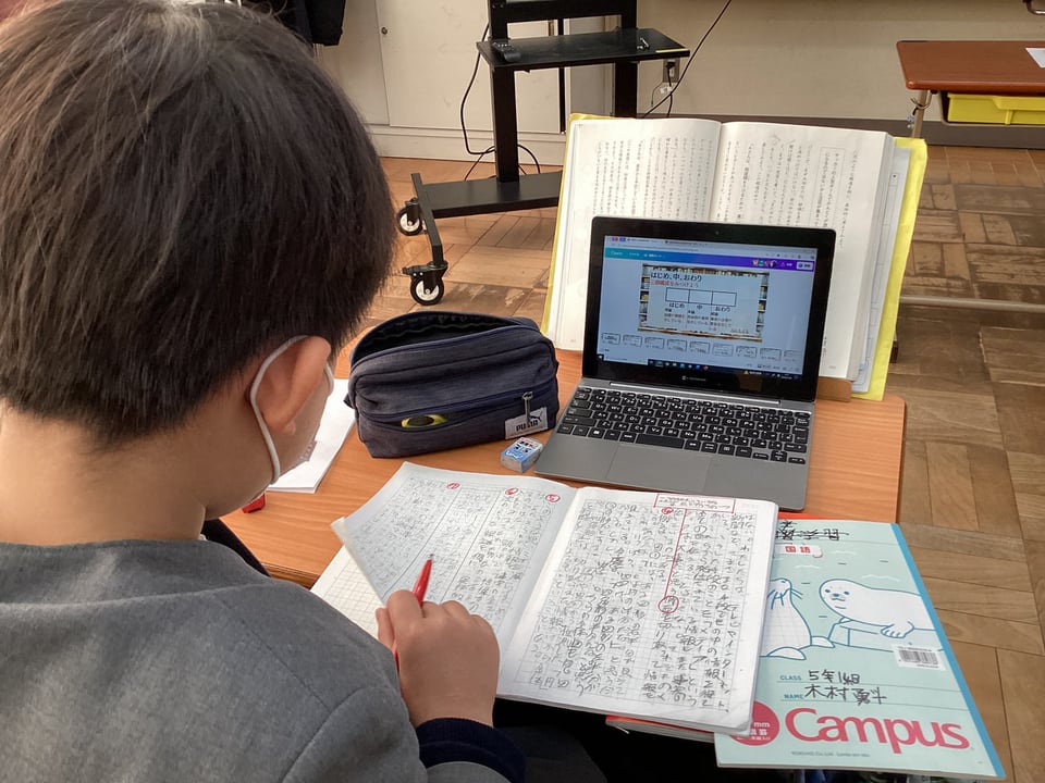 5・6年生が国語の「説明文」を、自由進度学習で取り組み始めました。説明文を読み解くための4つポイント「①意味調べ」「②構成」「③筆者の考え」「④自分の考え」に沿って、タブレット端末のテキストを読み取りながら、説明文を読み深めていくというスタイルの学習です。もちろん、疑問点は友達と相談し合ったり、互いの考えを共有したりする場面も設定されています。ここで学ばせたい内容が明確なことも、この学習スタイルのよさと言えます。二俣瀬スタイルの自由進度学習の一つになる可能性を大いに秘めています。