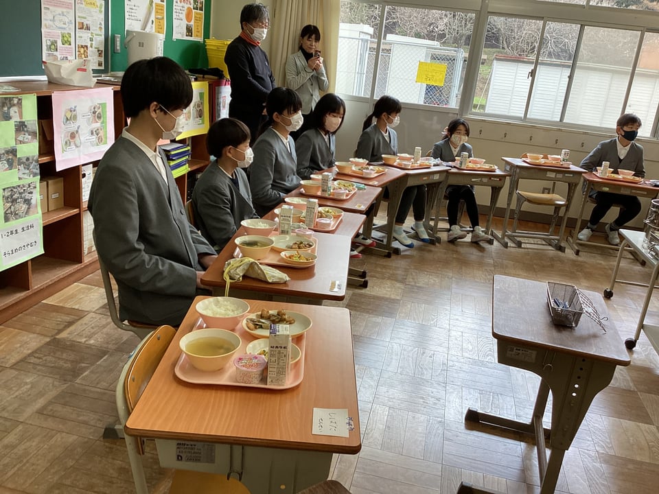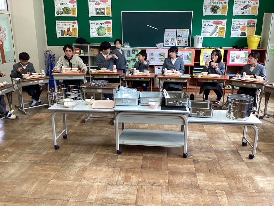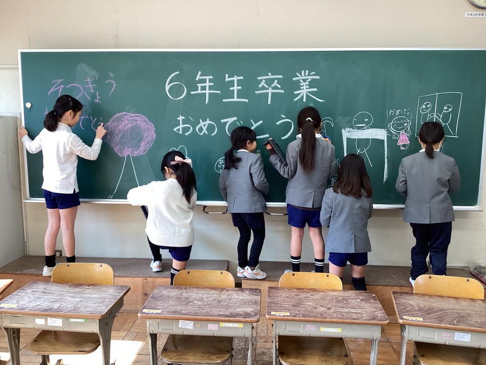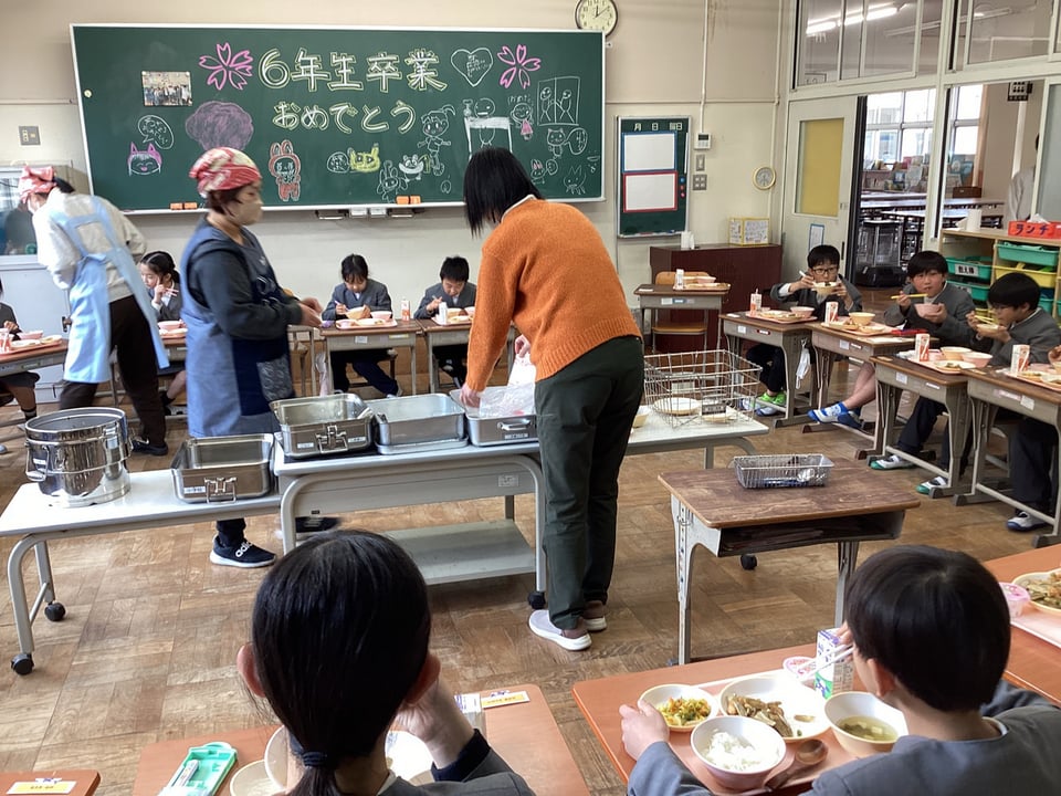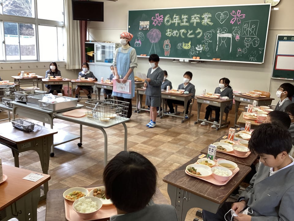 3月12日、明日の卒業証書授与式に向けて、給食では「6年生へのお祝い給食」メニューでした。その給食に向けて、低・中学年の子どもたちがサプライズの黒板への装飾を行ってくれました。なんと、心のやさしい子どもたちなのでしょう。この心遣いだけでも、明日の卒業式が成功することを予感させます。今日の給食では、6年生を囲んで輪になっての隊形にして、さらにお祝いムードを高めました。メニューは「ごはん・お祝い汁・チキンチキンごぼう・キュウリとキャベツのサラダ・お祝いゼリー・牛乳」です。
