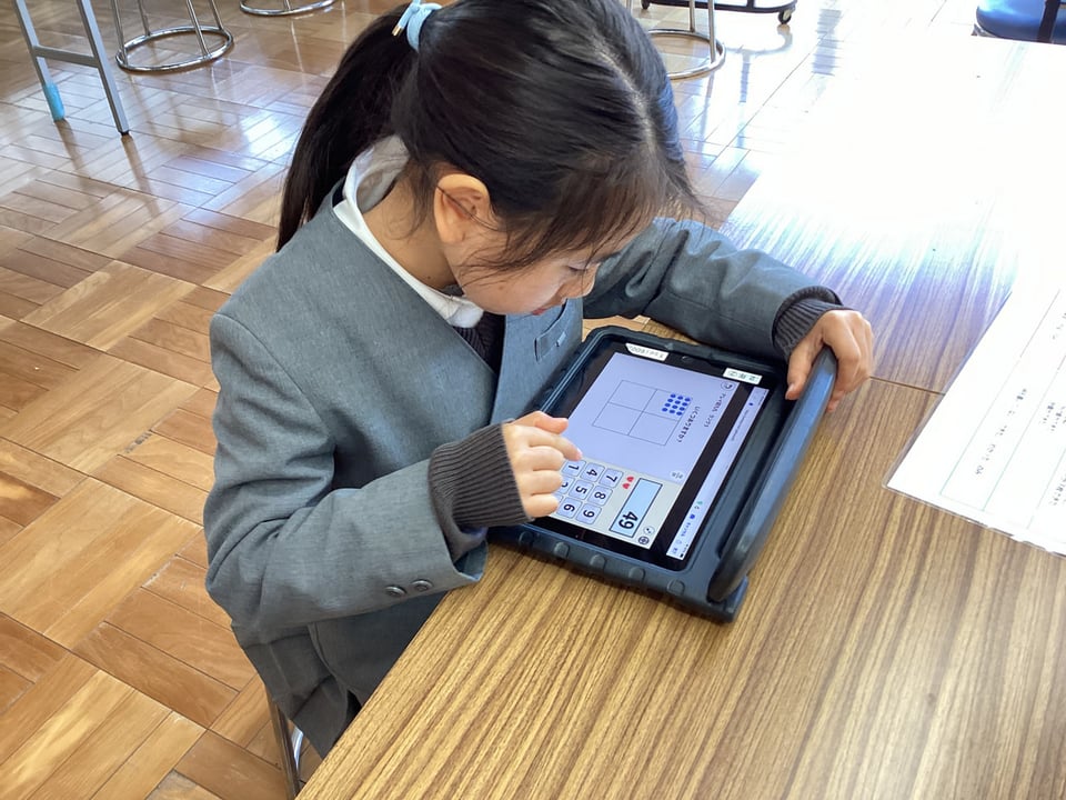 2年生は算数「かけ算」のまとめの学習を、「AIドリル」や「デジタル教材」などを活用しながら行っています。自分の苦手なところが明確になるので、それを克服するために、繰り返し計算や問題に挑戦しています。このようにして、自分の苦手と向き合い、楽しみながらタブレット端末学習に取り組んでいます。