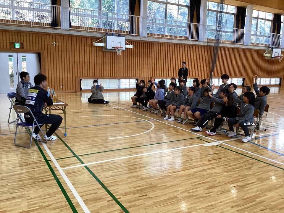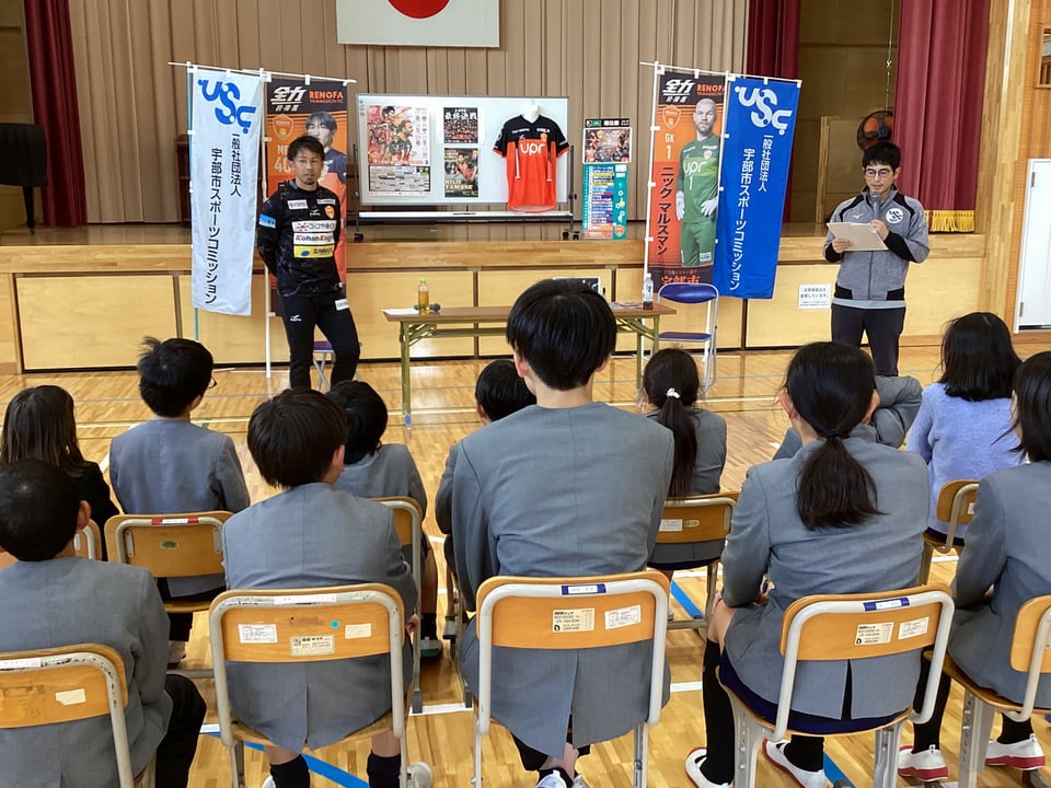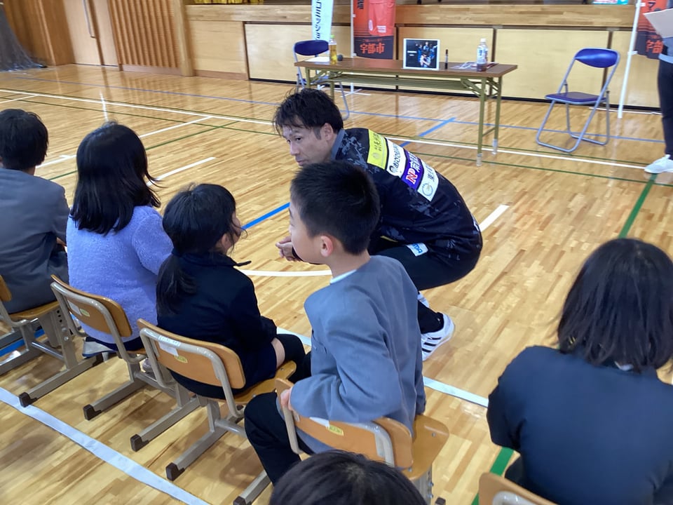11月27日、子どもスポーツ夢教室のレノファ山口山瀬選手との実技演習の後は、体育館で講話をしていただきました。子どもたち一人ひとりに気さくに話し掛けてくださる姿がとても印象的でした。講話では、ご自身の幼少期の頃の性格や夢中になっていたことを話してくださいました。そして、「夢に向かって挑戦することの大切さ」を子どもたちに優しく語りかけてくださいました。また、子どもたちからの質問にも一つひとつ丁寧に答えてくださいました。質問する子ども、そして、その答えを聞く子どもたちの目が輝いていました。とてもお忙しい中、二俣瀬っ子のために、時間を割いてくださった山瀬選手やレノファ山口の関係者のみなさんに心から感謝いたします。今回の体験やお話は、きっと子どもたちの心に一生残っていくことだと思います。