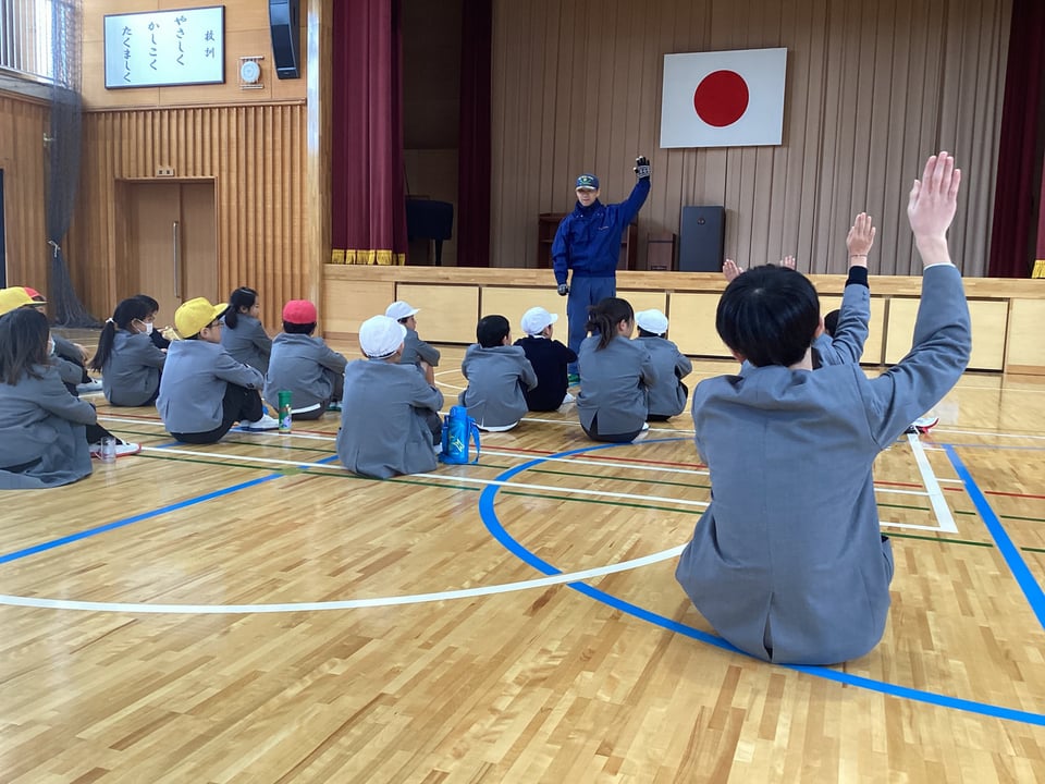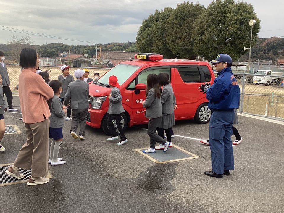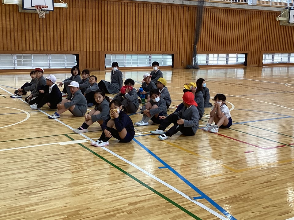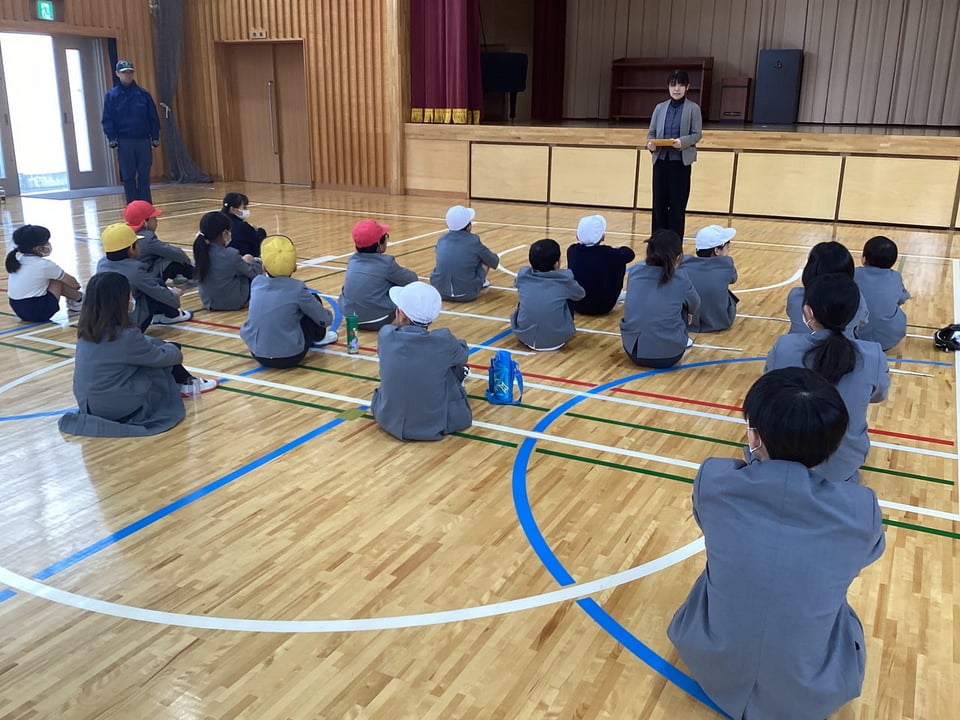 誘導後は安否確認をして、本日の避難訓練の振り返りをしました。児童全員は「お・は・し・も」の約束をすべて守ることはできなかったようです。次回の課題となりました。消防署の職員さんから、本日の避難の仕方について、よかった点と課題点などを講評していただきました。