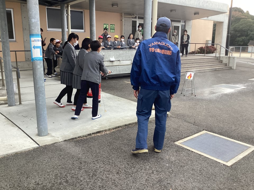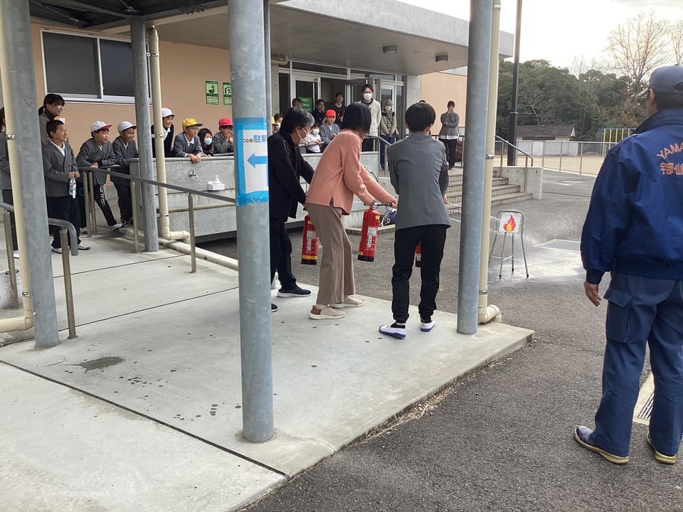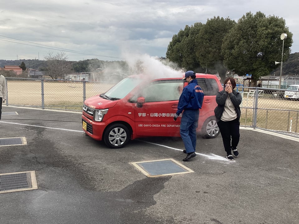 最後に、場所を変えて消火訓練と煙体験を行いました。正しい消火器の使い方を再確認しました。また、煙体験では、煙の回る速さを見学して、あっという間に有毒ガスが車中に回ることを実感することができました。今回の「避難訓練」や「消火訓練・煙体験」を通して、いざというときに、自分で正しく判断し行動できる実践的能力を身に付けてほしいと願っています。