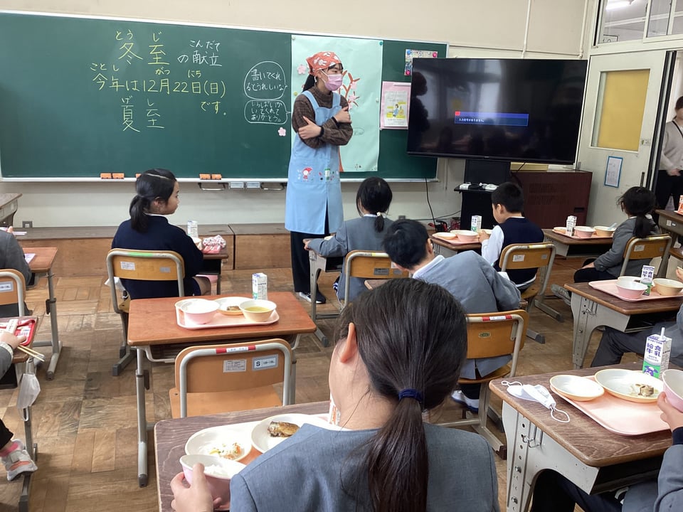 12月19日の給食は、冬至にちなんだ献立でした。冬至には、かぼちゃや小豆がゆを食べたり、ゆず湯に入ったりする習わしがあります。寒い冬をしのぐ昔の人の知恵とも言えます。この日の給食には、かぼちゃの味噌汁とゆずの香和えが出されました。このように季節にちなんだ給食を通して、昔の人々の知恵にふれることも大切にしています。