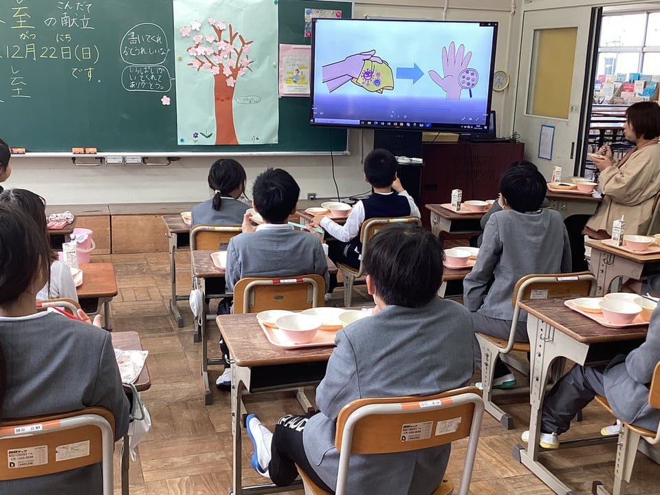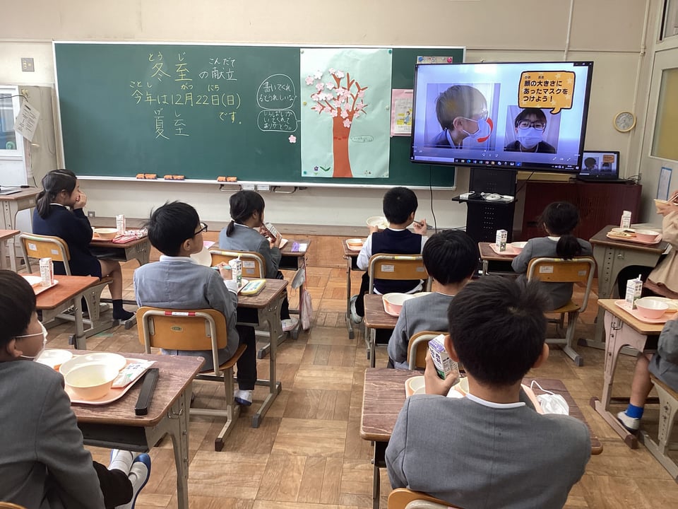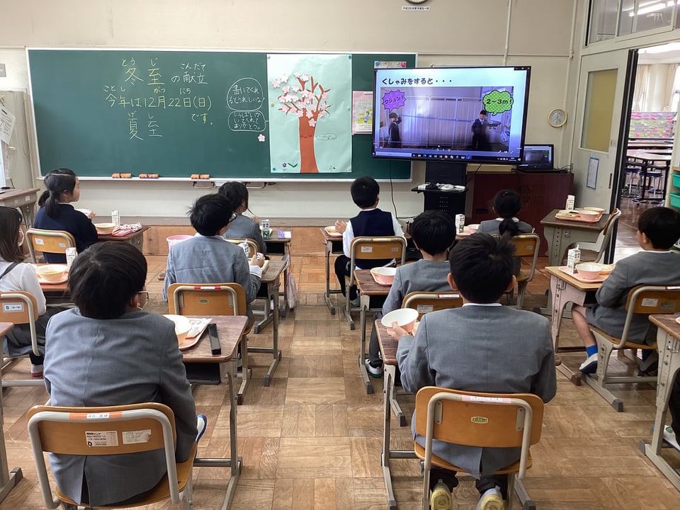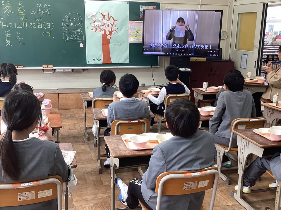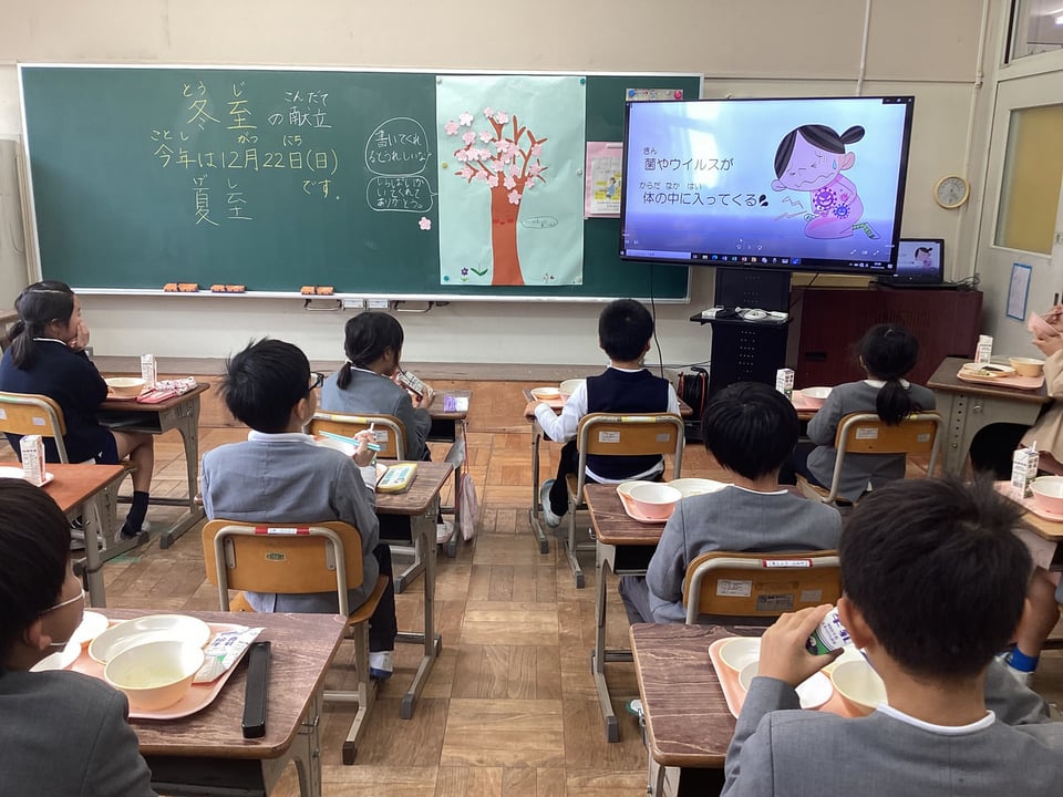 12月19日の給食時間に、環境・保健委員会の子どもたちが撮影した動画「かぜに負けない生活をしよう」を発表しました。かぜやインフルエンザが流行するこの時期に、環境・保健委員会から全校の子どもたちに向けて、気を付けたいことを動画で紹介してくれました。せきエチケットやマスクの効果、手洗いとハンカチの重要性などについて、絵や図、自分たちの取組等で分かりやすい動画に仕上がっていました。このように、委員会活動を通して、子どもたちが自分たちで主体的に啓発活動を行ってくれることに大きな意味があります。きっと、全校の子どもたちの主体的な活動へとつながっていくはずです。