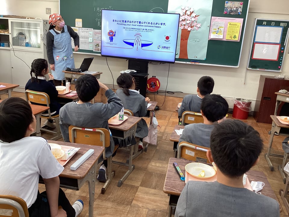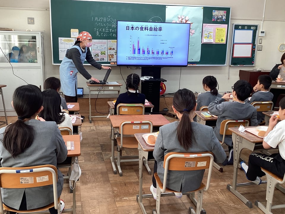 1月28日、学校給食週間の3日目は、栄養教諭による講話「食料自給率アップメニュー&食品ロス」でした。この日の給食メニューは「黒糖パン・ミートスパゲティ・卵と野菜のバター炒め・オレンジ」です。食料自給率アップをめざして、自給率の低い「小麦」や「オレンジ」などを意識したメニューにしたそうです。「地産地消」と言いますが、自分たちが口にするものは、できる限り地元産にしていくことも大切な食育の視点ですね。また、食品ロスの話もありましたが、自分が食べ物を残せば、ゴミになってしまいます。「もったいない!」という気持ちをもって、苦手なものでも残さずに食べるという習慣を身に付けていきましょう!これも、給食に感謝することにつながります。
