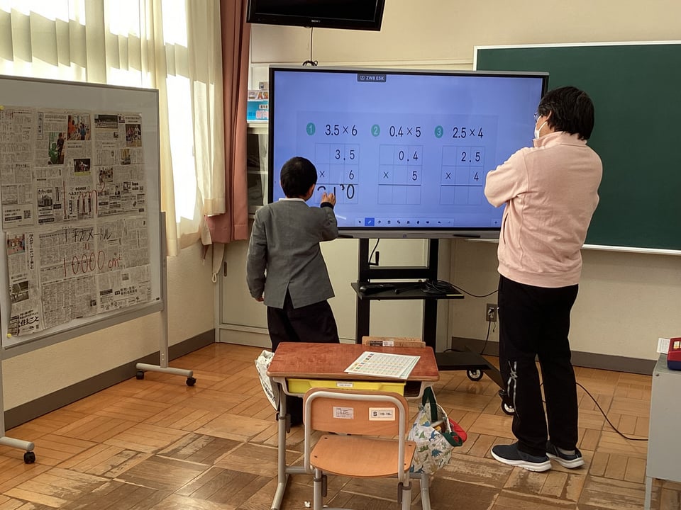 なかよし学級では算数で「小数のかけ算」に取り組んでいます。電子黒板に問題を写し出し、そこに筆算をしながら計算問題にチャレンジしています。こうすることで、その子なりの計算方法や見方・考え方をしっかりと見取ることができます。自ら進んで学んでいく姿勢が身に付いていることに感心します。