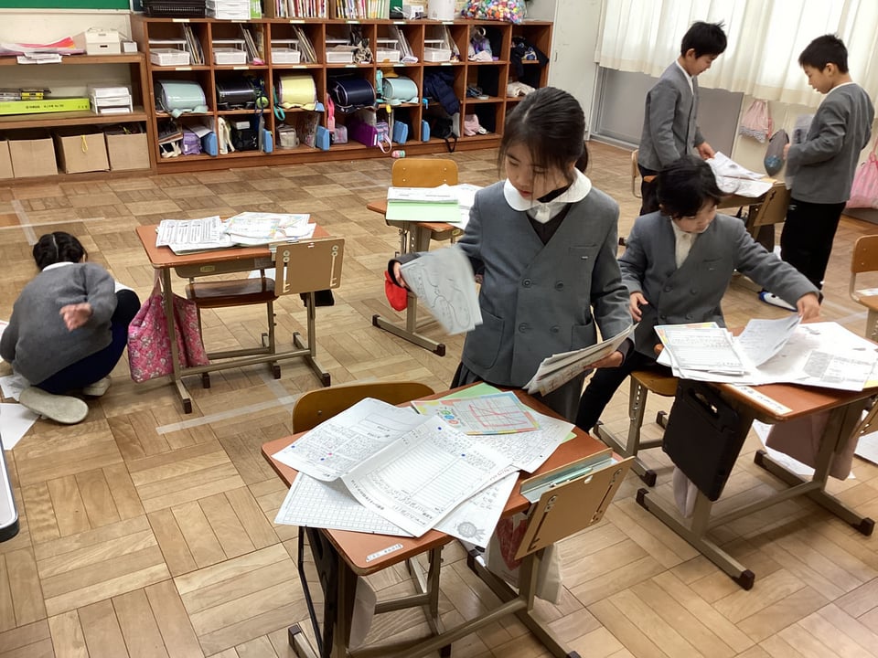 1・2年生は、これまで「学び直しタイム」や国語、算数で学習した「学びの履歴物」をファイリングして整理しました。「こんなによくやったなあ」「このプリント、よく覚えている」などと、自分のこれまでのがんばりや取り組んだときのエピソードなどを振り返りながら、プリント類をファイリングしていきました。このように、履歴物を整理し、自分の成長を実感させることはとても重要です。