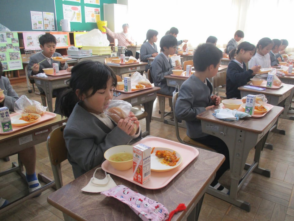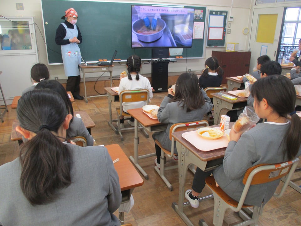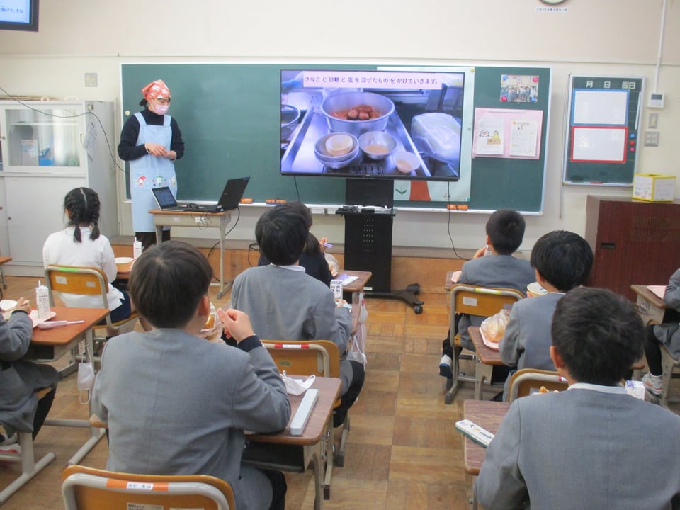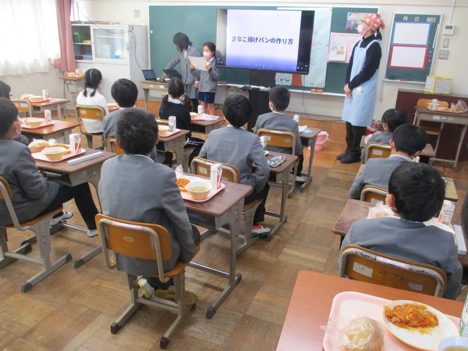 2月18日の給食は「きな粉揚げパン」でした。朝から子どもたちは「今日は楽しみ!」を連発していました。「いただきます!」のあいさつと同時に、子どもたちは一斉に「きな粉揚げパン」にガブリ!予想した通りの笑顔でした。給食を食べながら栄養教諭が、本日の「きな粉揚げパン」の作り方をパワーポイントで紹介してくれました。給食調理員のみなさんが手作りで一つひとつ丁寧にパンを揚げて、きな粉をまぶしてくださる姿に、みんなで感謝しました。本当に「ごちそうさま」でした。とてもとてもおいしかったです!